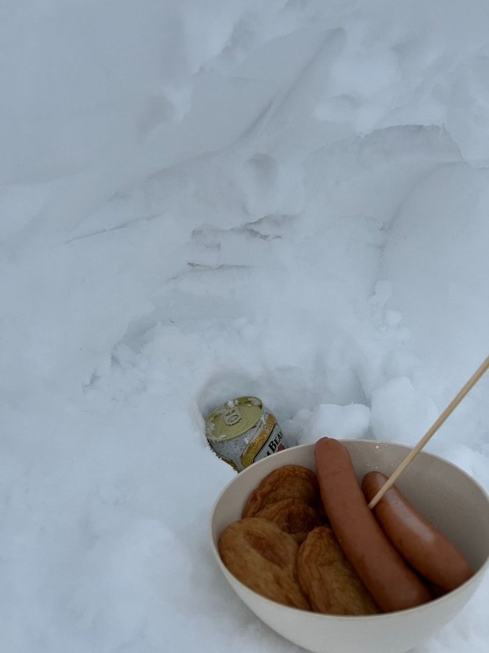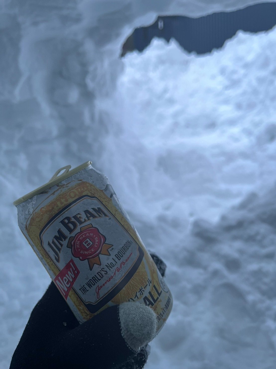 かまくらの中って暖かいから寝そべりながらつまみとハイボール