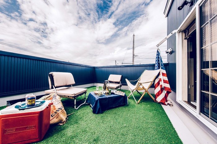 - ガレージ上の大きなバルコニー、土間の棚はキャンプギアをディスプレイ。
