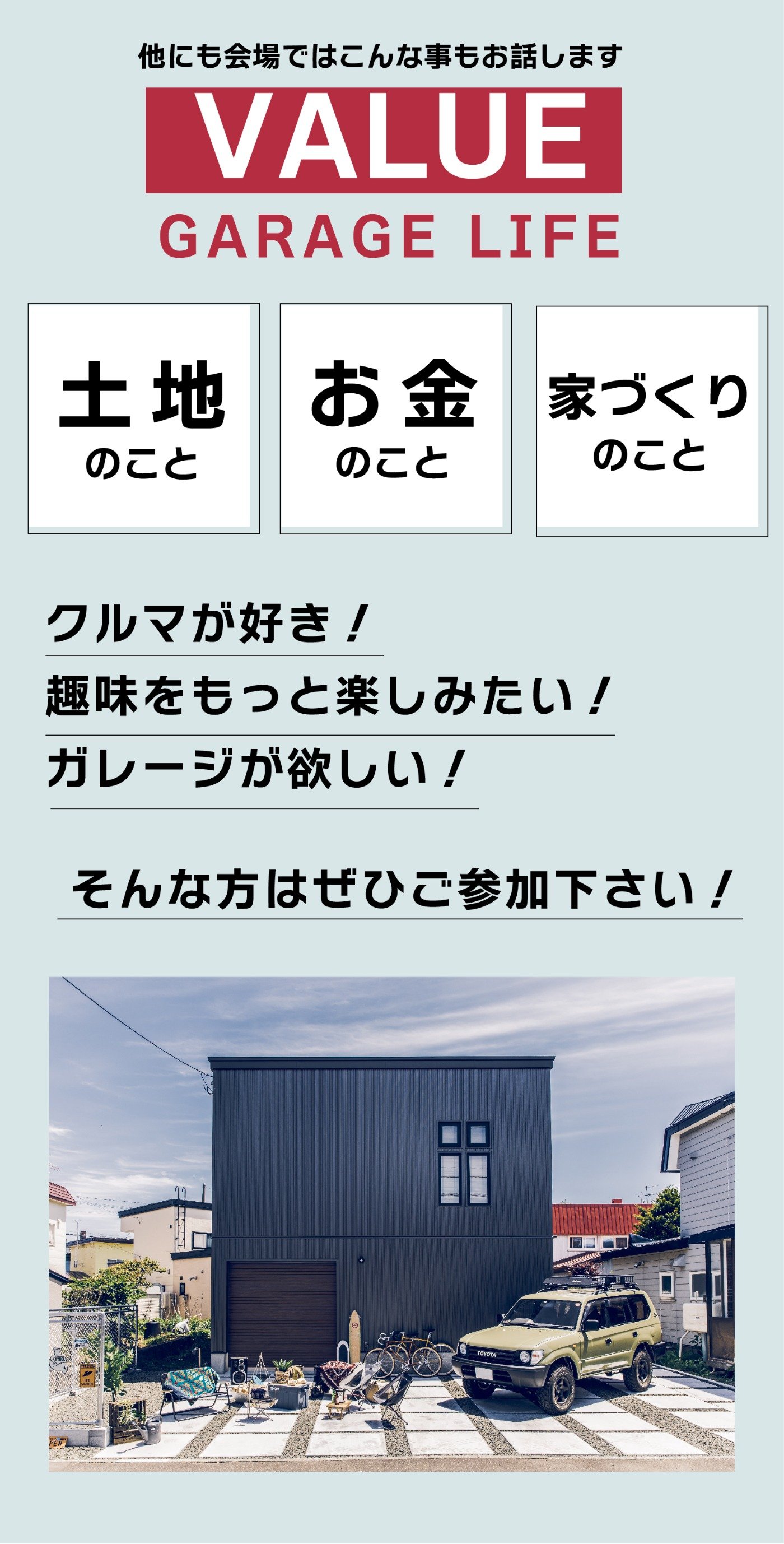 クルマ、趣味を楽しみたい人のためのガレージハウスセミナー