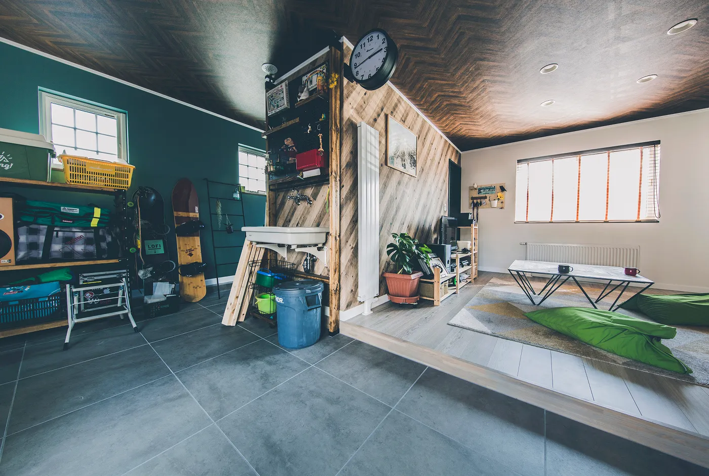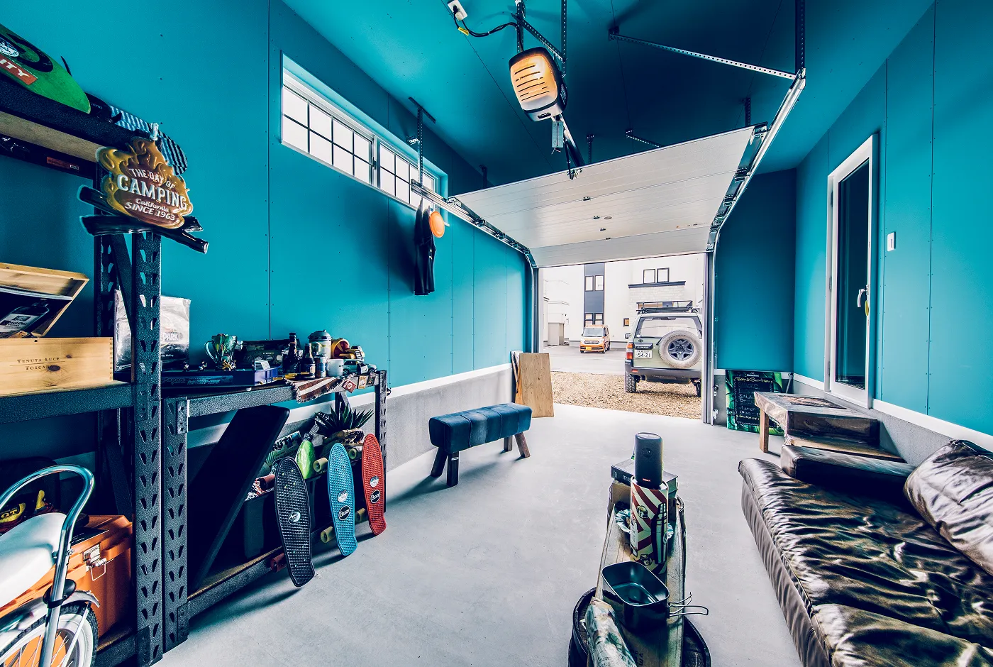 スペースを設けたガレージと広い土間は、