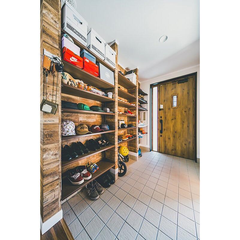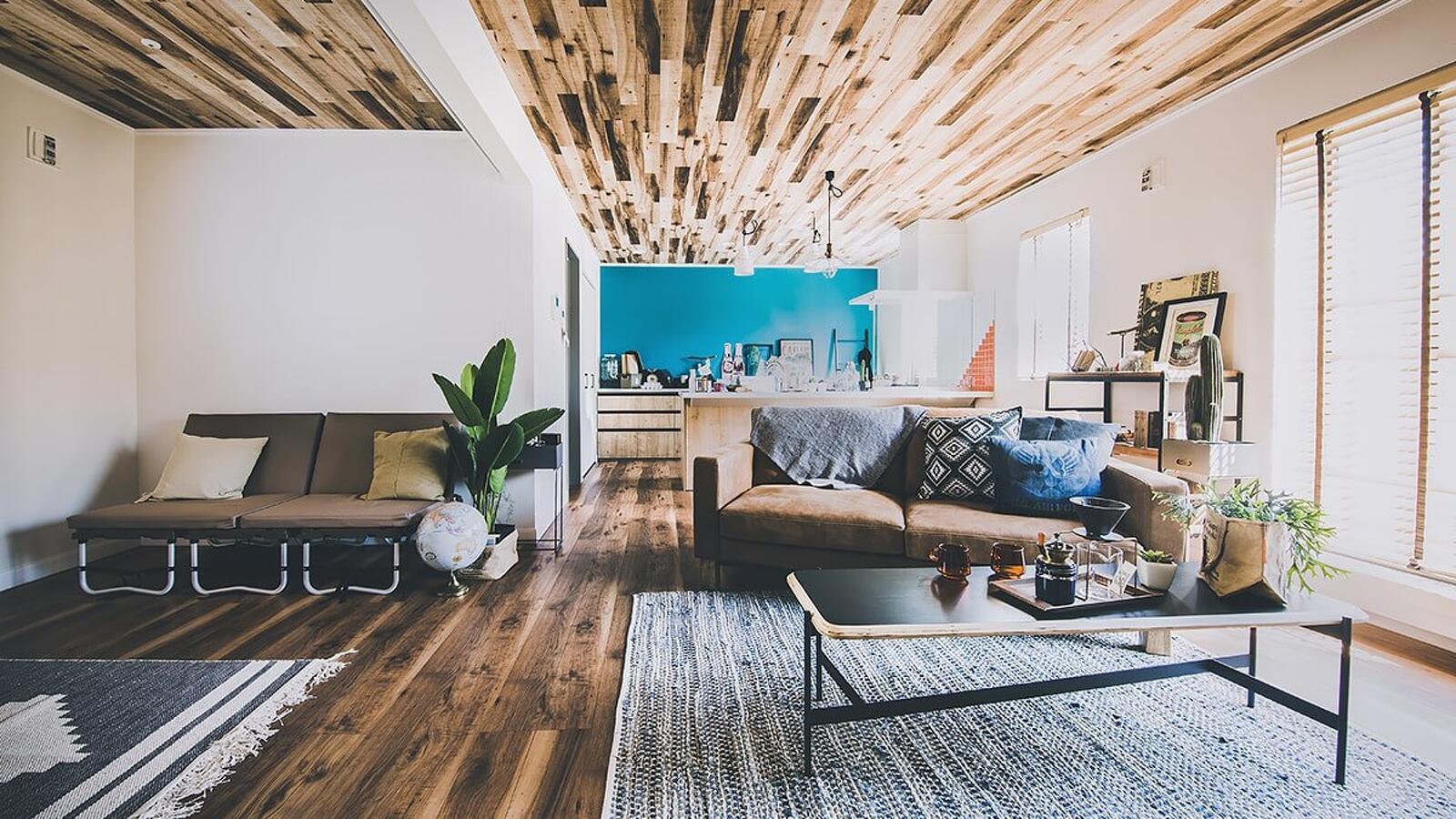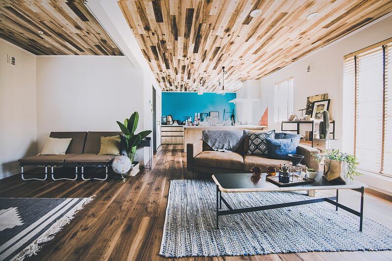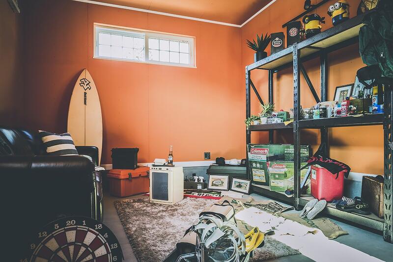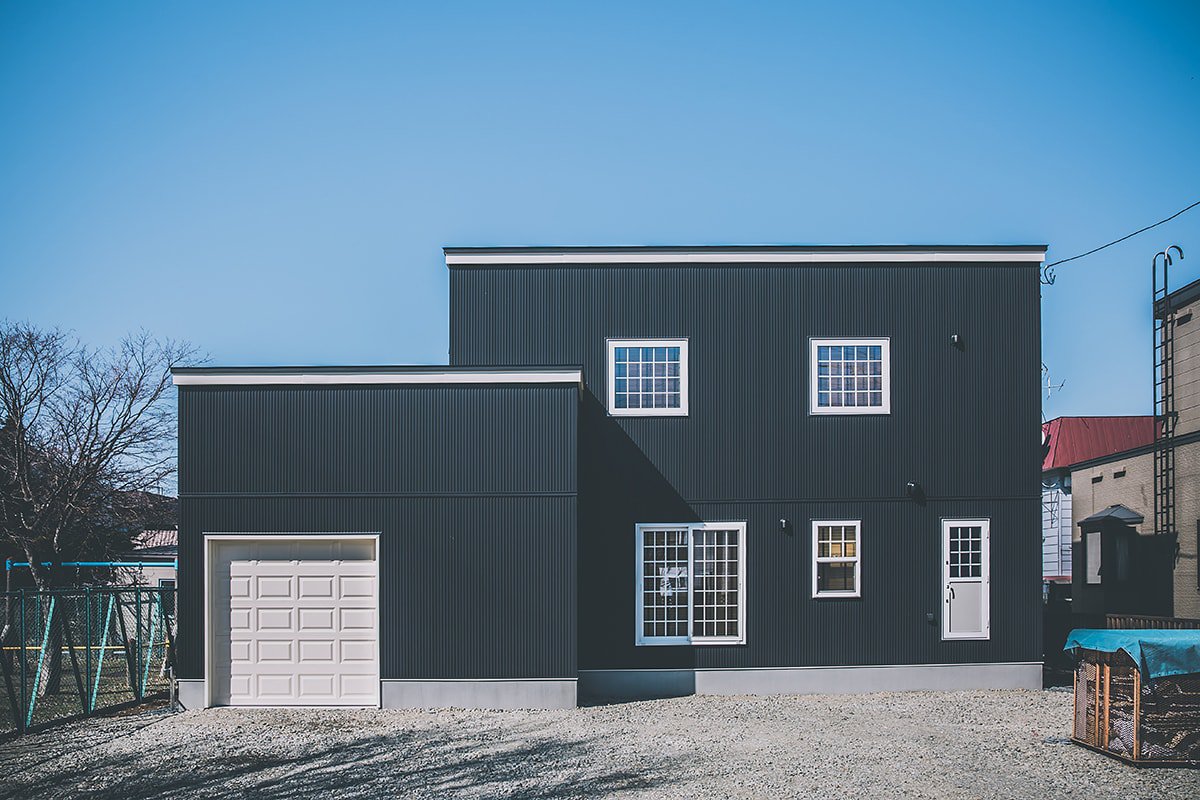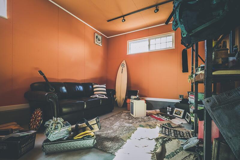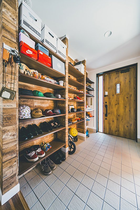 家族で過ごす、開放感を重視したリビング。仲間との遊び場にもなるガレージは、好きなモノを詰め込み、自由にアップグレードする楽しみも。玄関土間の収納スペースには、スノーボードや自転車など趣味アイテムをディスプレイ感覚で。