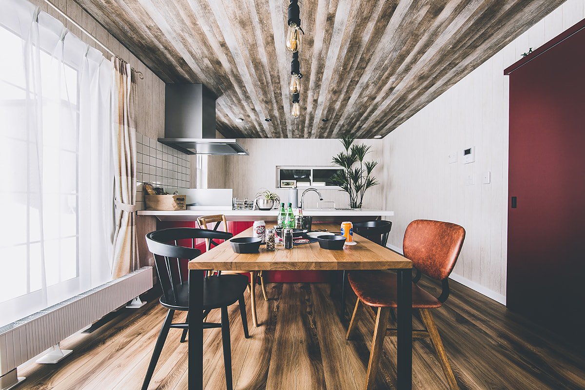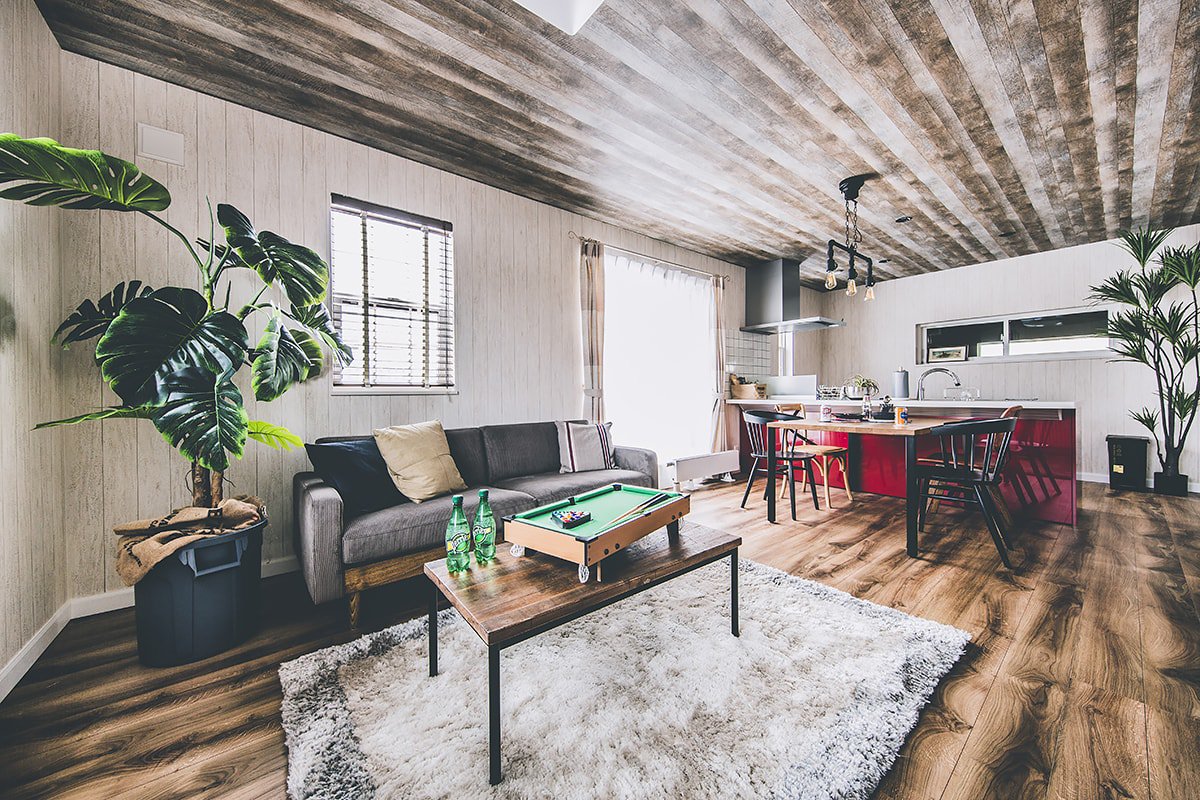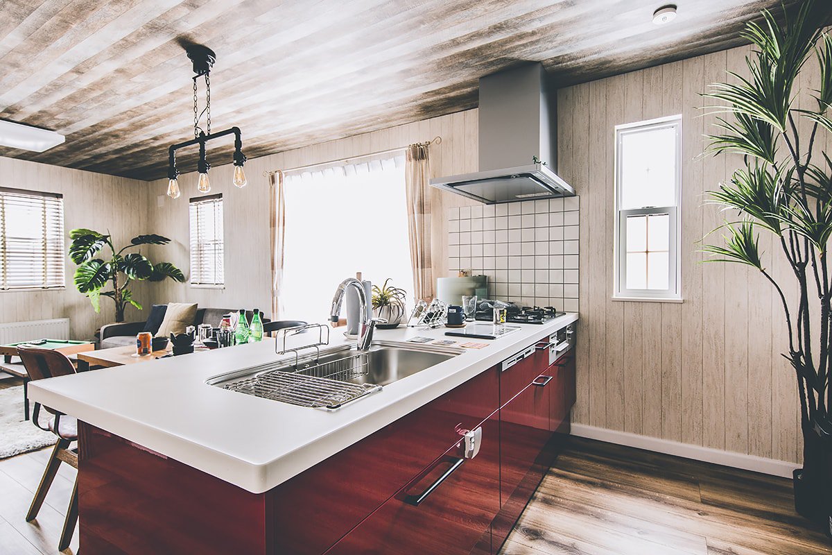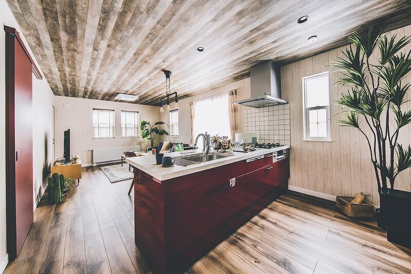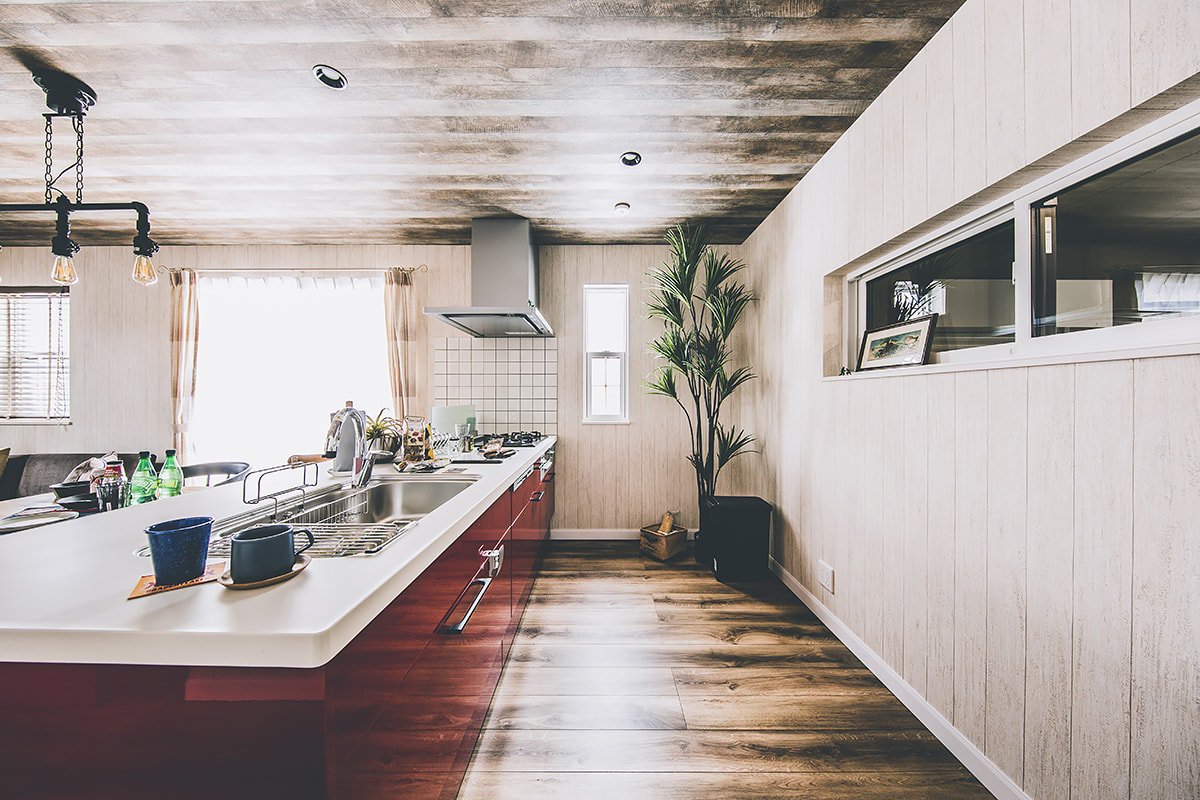 車いじりやDIYを全力で楽しむ、趣味のためのガレージ。キッチン背面にガレージへ視線が抜ける窓を設置して、愛車との距離を近く。木目の天井クロスを生かしたリラックス感あるインテリア。