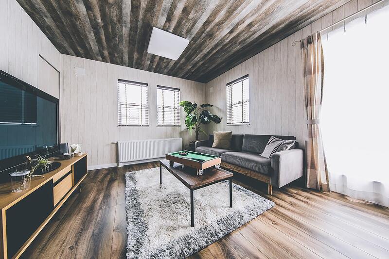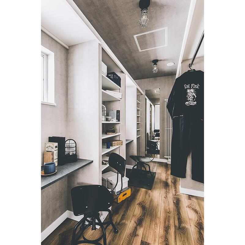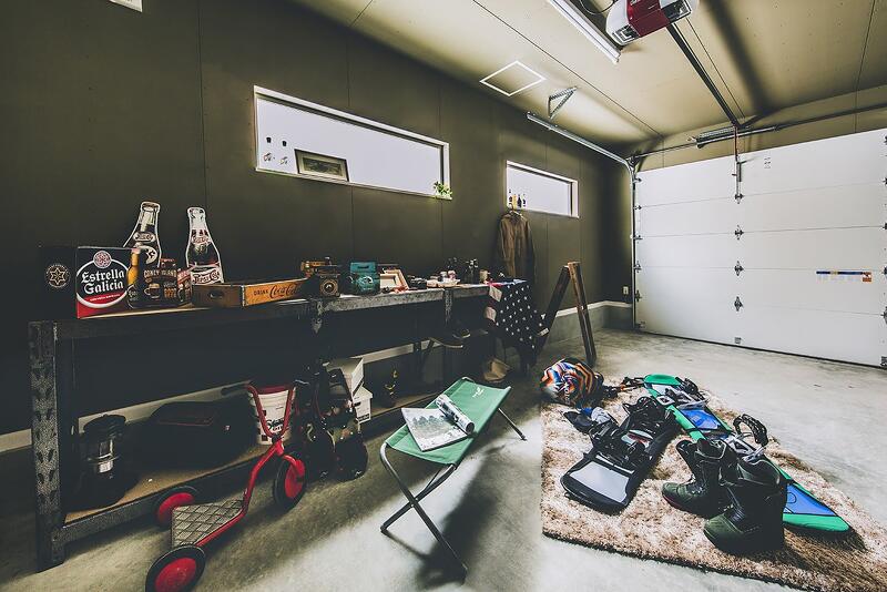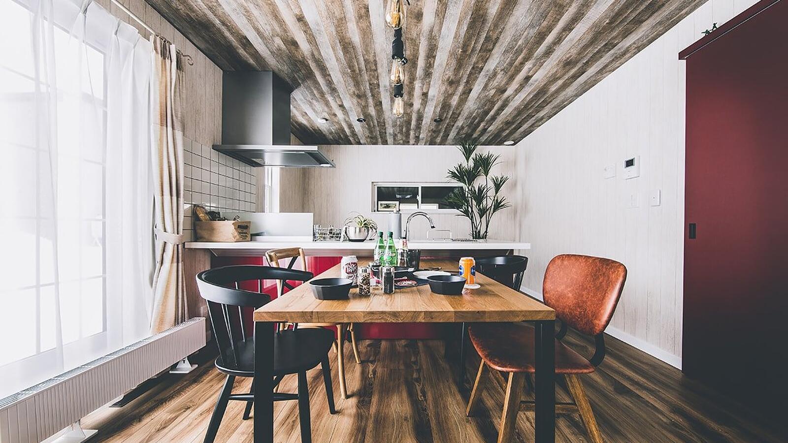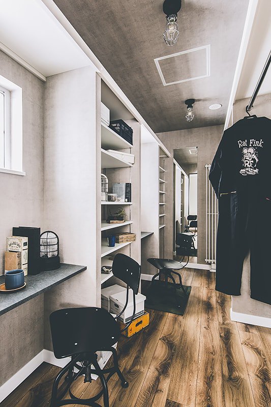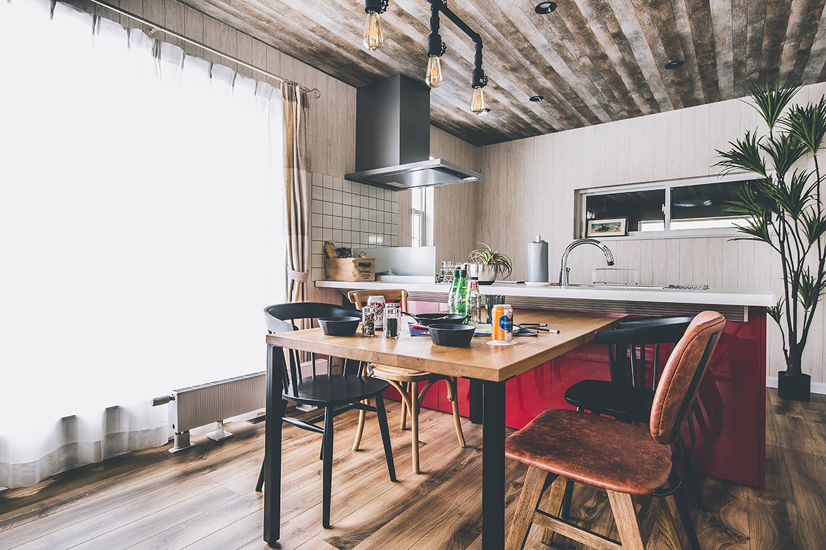 車いじりやDIYを全力で楽しむ、趣味のためのガレージ。キッチン背面にガレージへ視線が抜ける窓を設置して、愛車との距離を近く。木目の天井クロスを生かしたリラックス感あるインテリア。