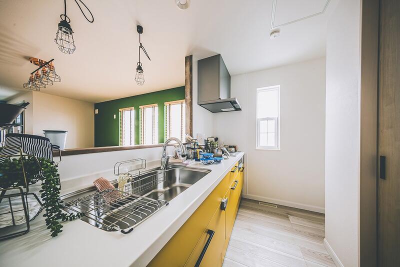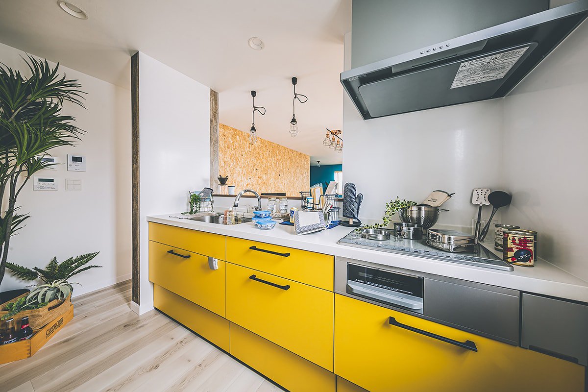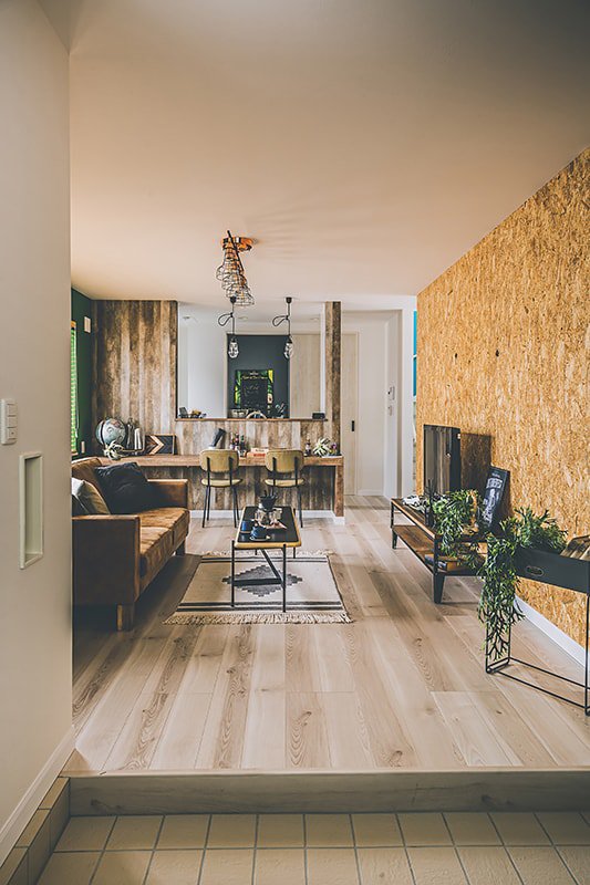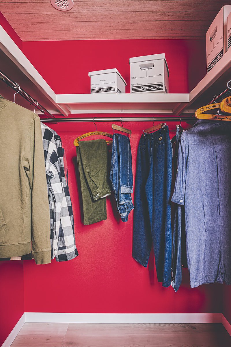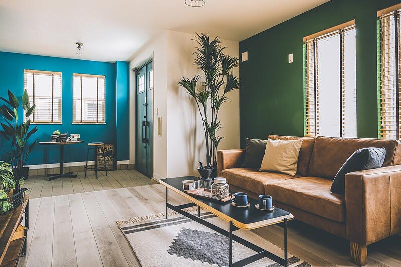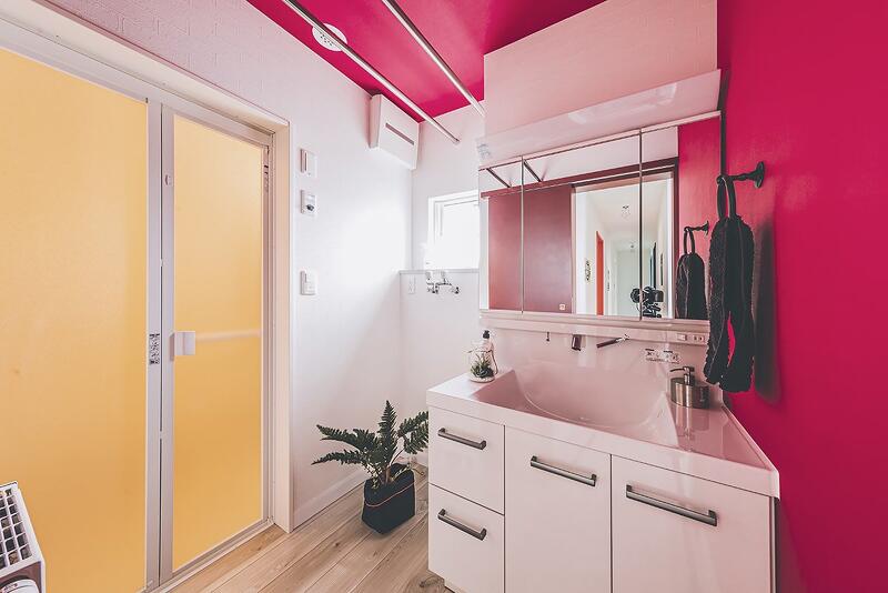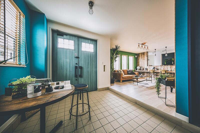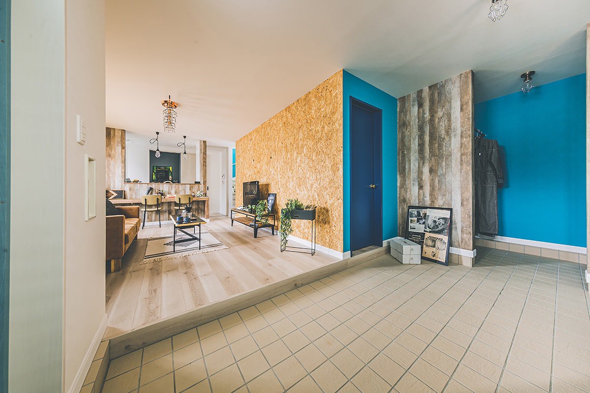 ブルーやグリーン、ピンクなど原色のクロスを使用した、カラフルで唯一無二な空間。趣味を思いきり楽しめる玄関土間。ゆったりサイズのシューズクローゼットも。