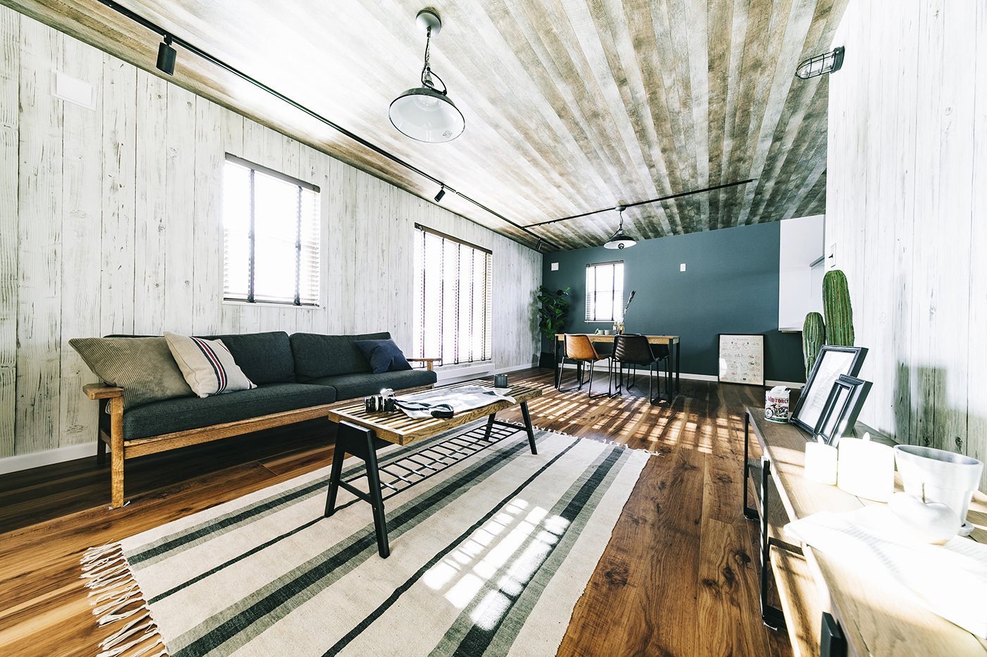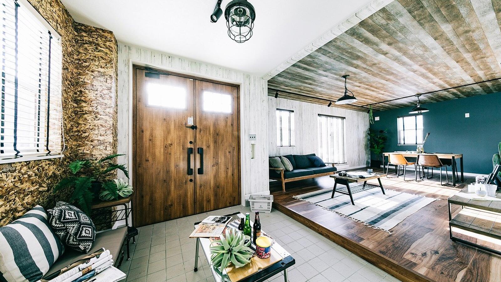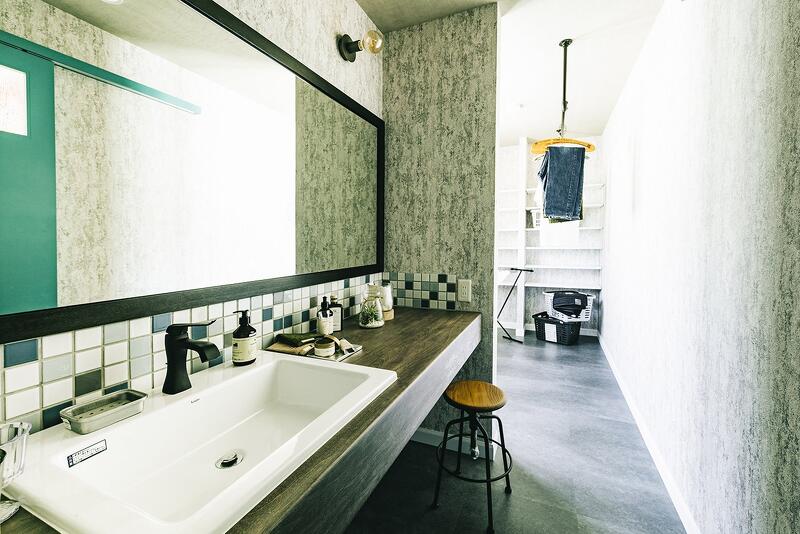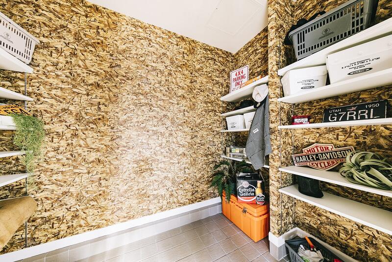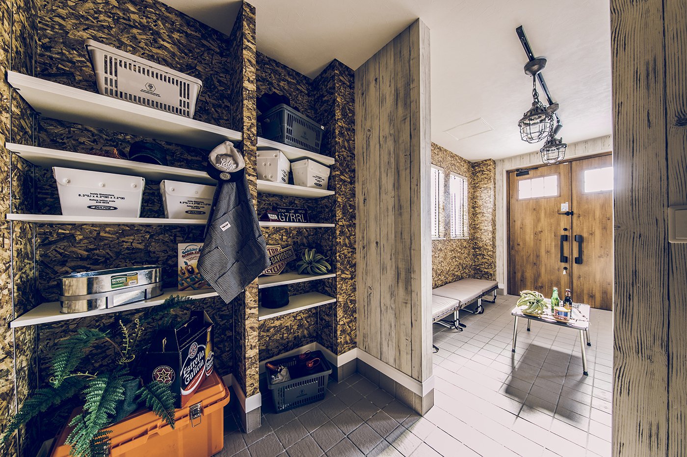 バイクを弄るための広い土間。リビングから愛車を眺める楽しみも。 OSB合板やタイル柄クロスでインパクトあるカッコいい空間に。 広々収納で増え続ける趣味の道具もスッキリ片付く。