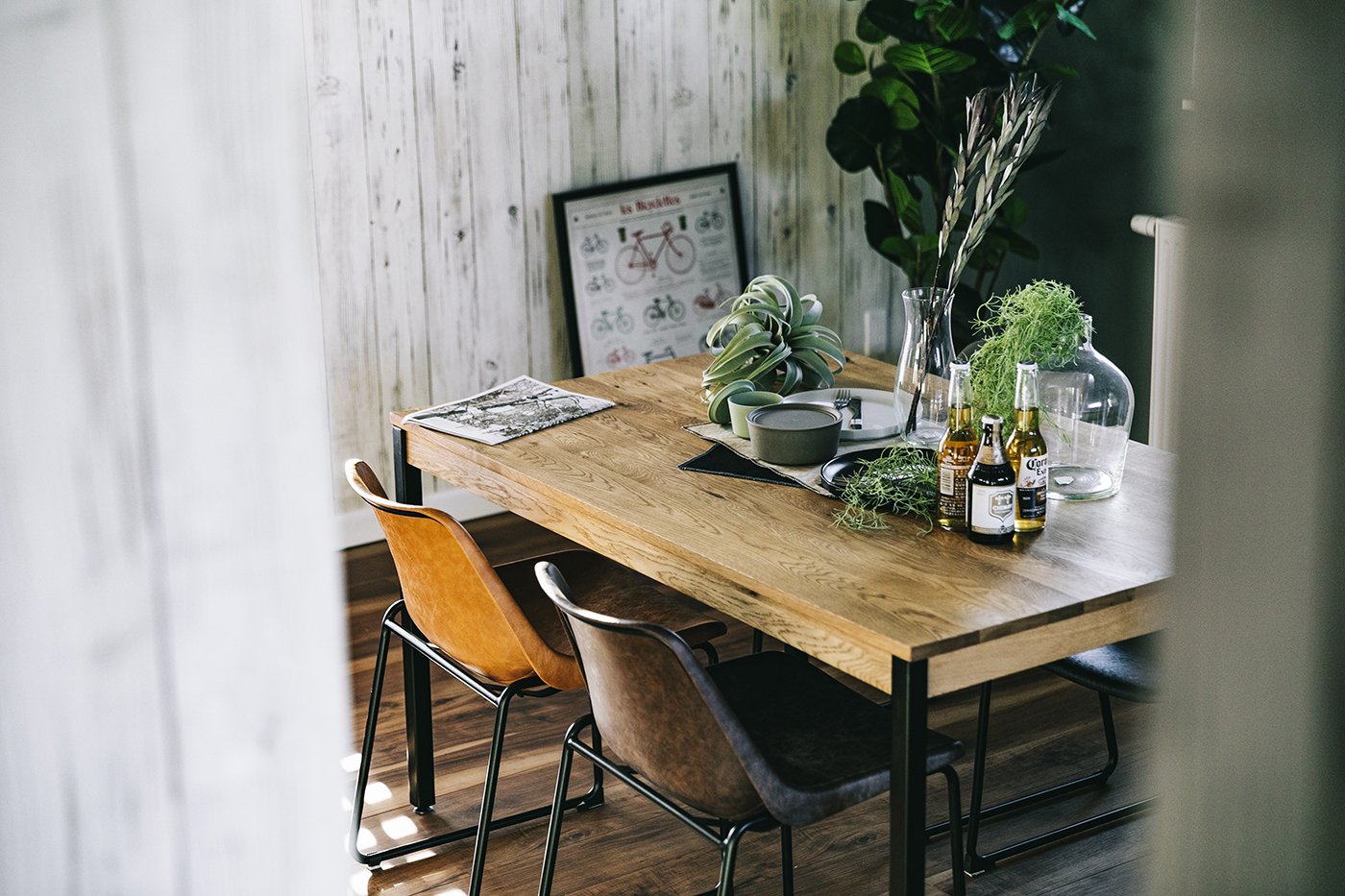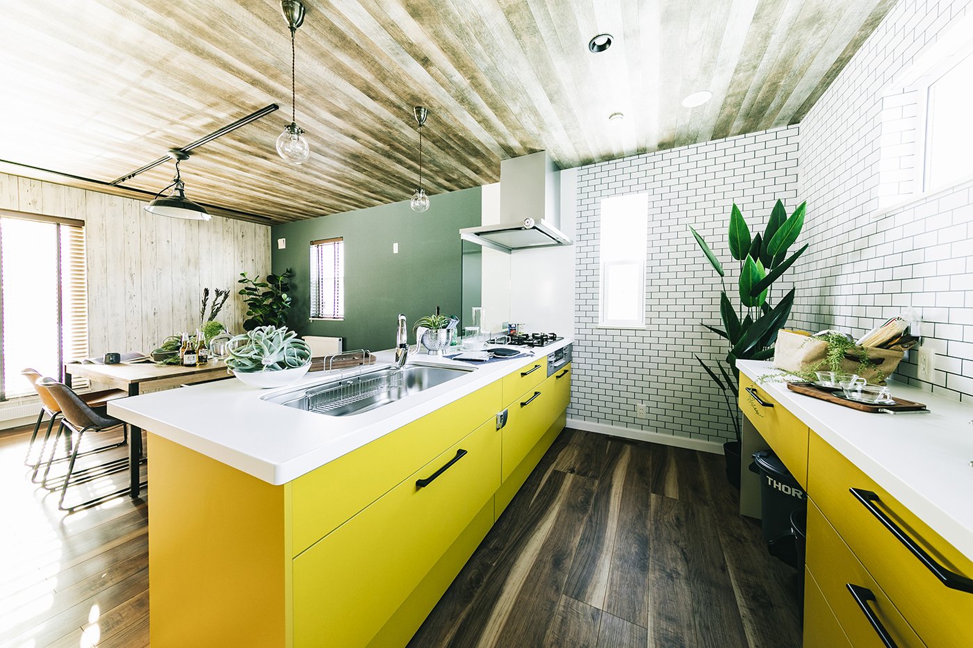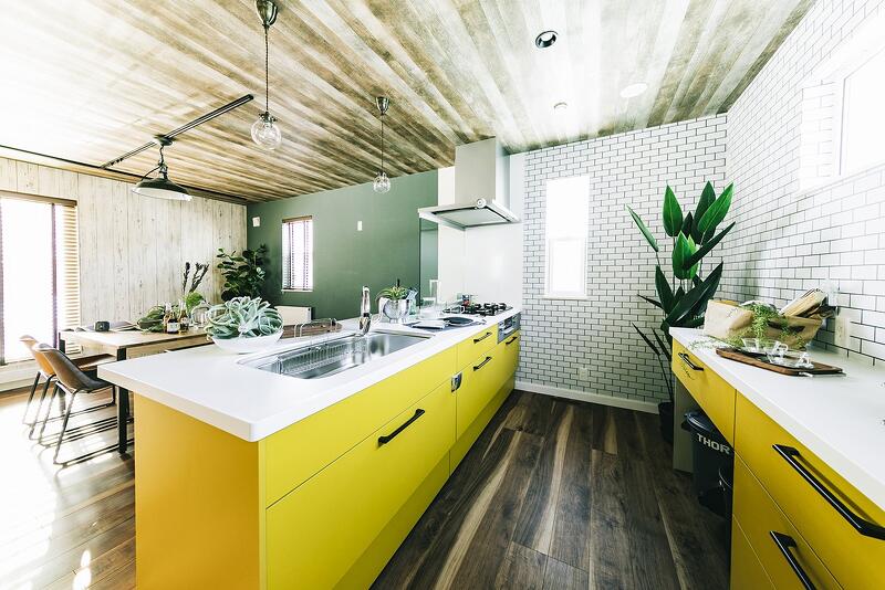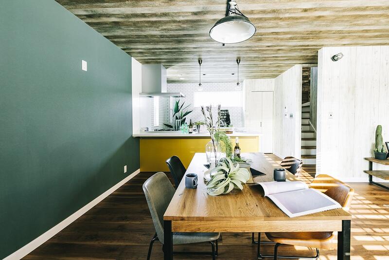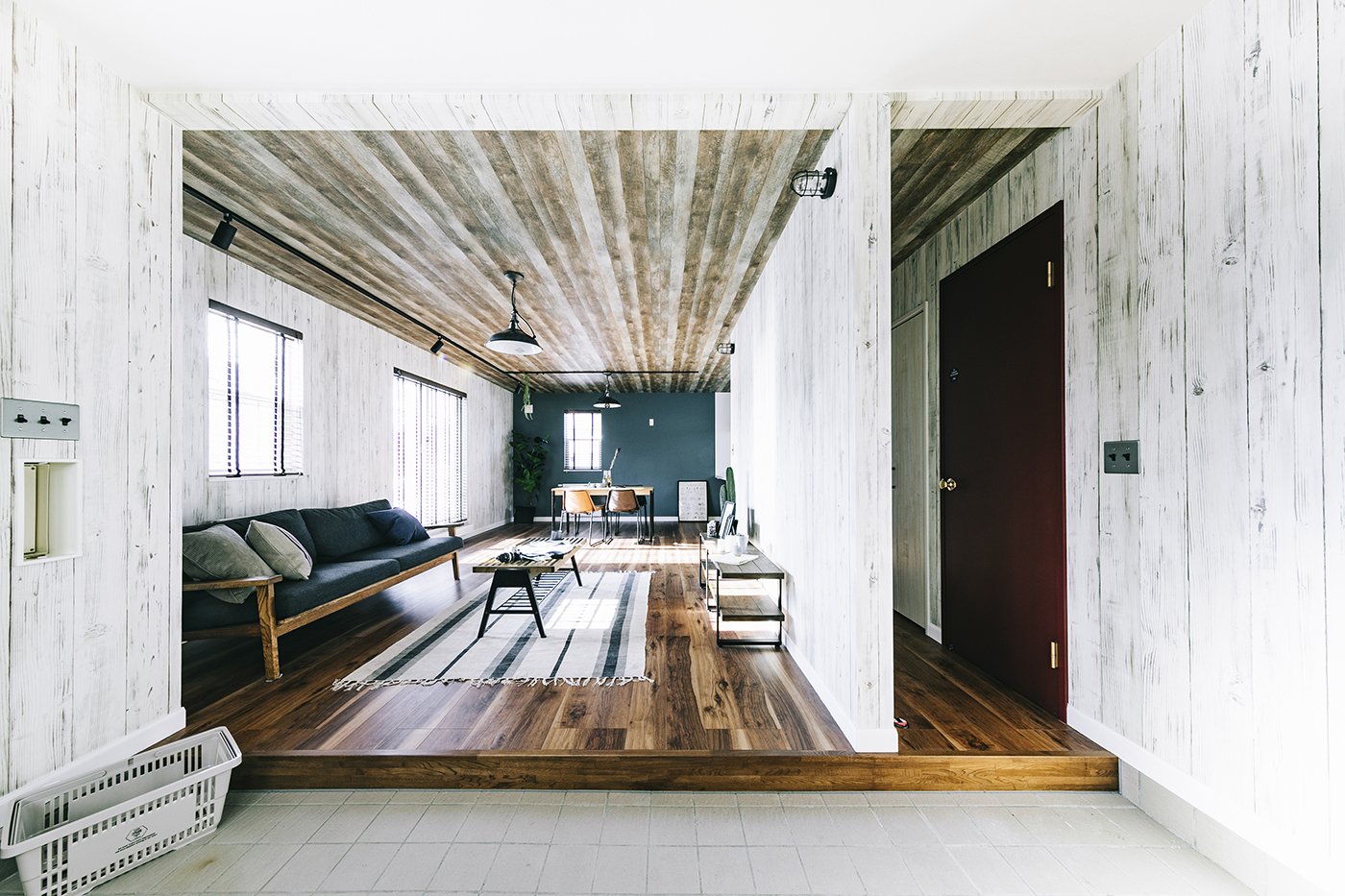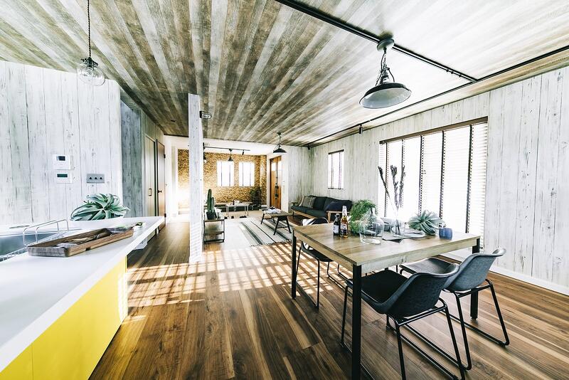 バイクを弄るための広い土間。リビングから愛車を眺める楽しみも。 OSB合板やタイル柄クロスでインパクトあるカッコいい空間に。 広々収納で増え続ける趣味の道具もスッキリ片付く。