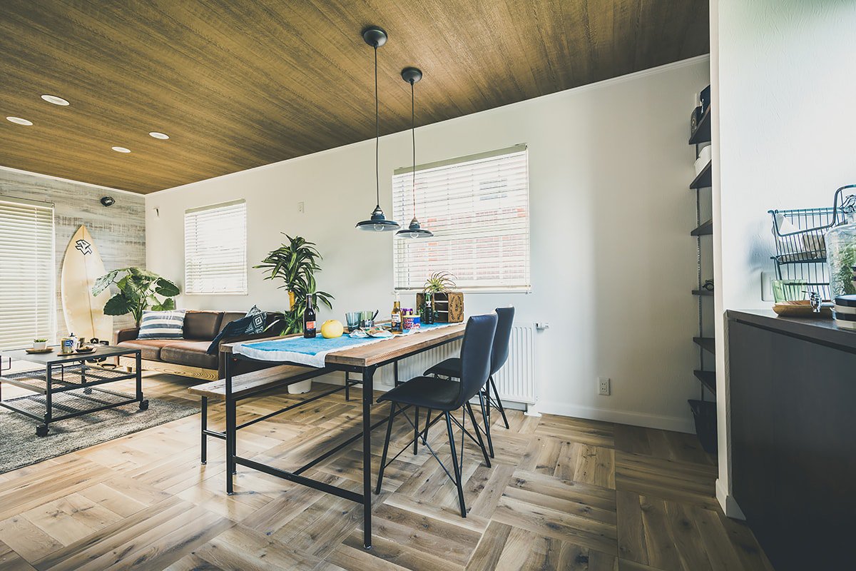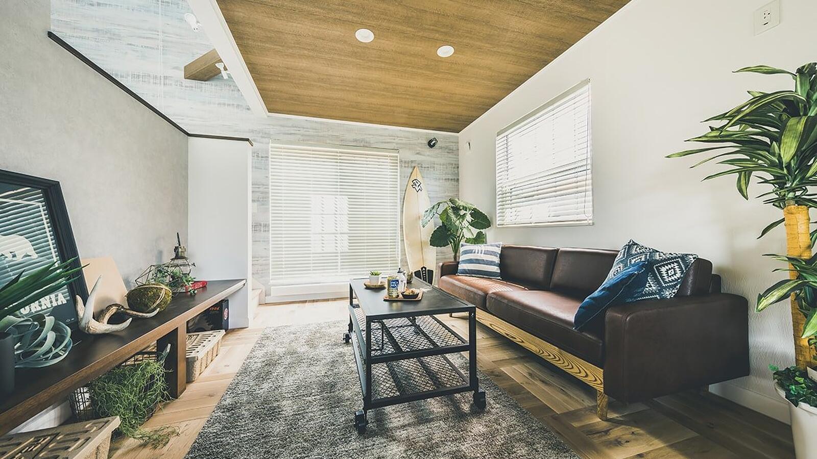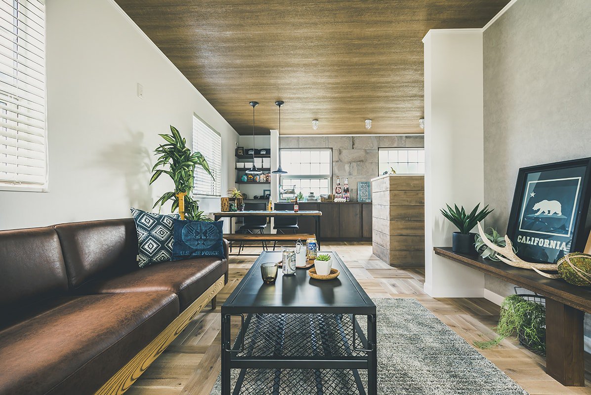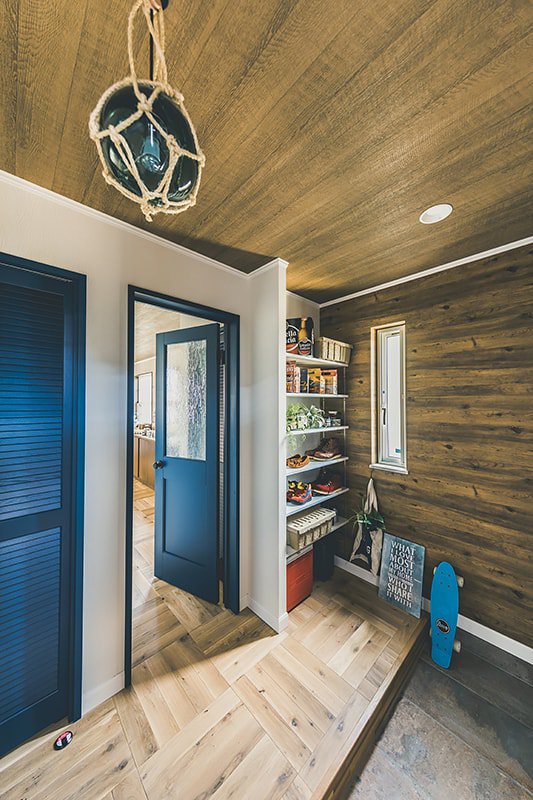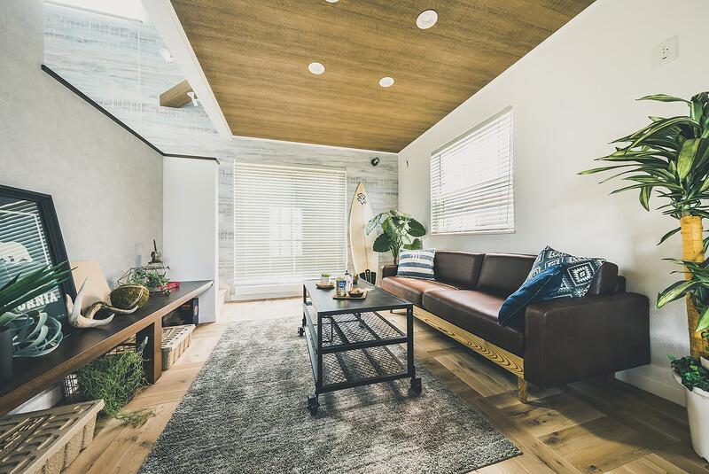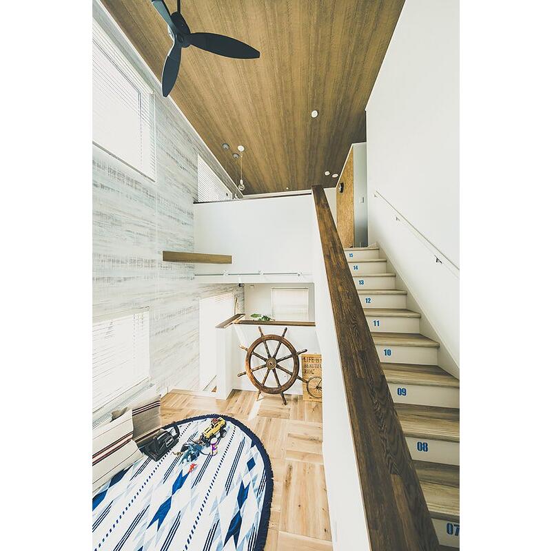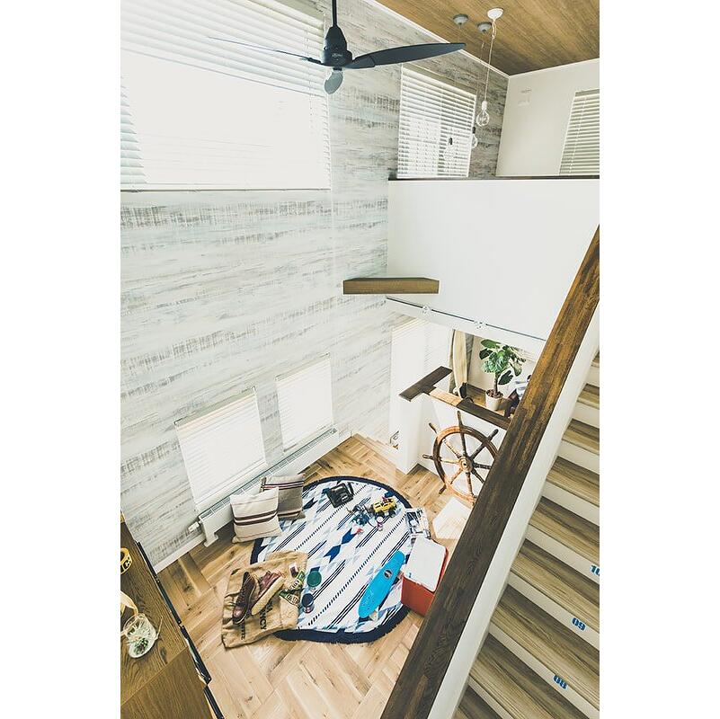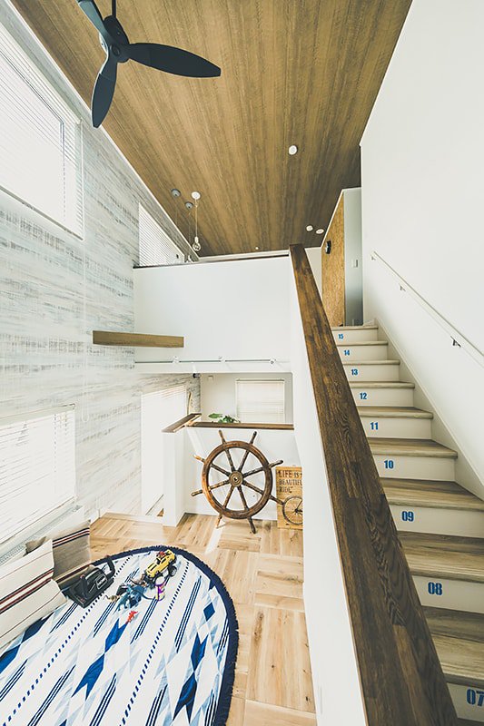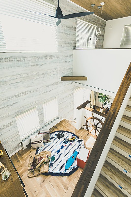 家の真ん中の吹き抜け部分に設けたデッキのようなくつろぎスペース。インテリアはブルーをアクセントにしたマリンテイスト。石やタイルの存在感がカッコいい家。