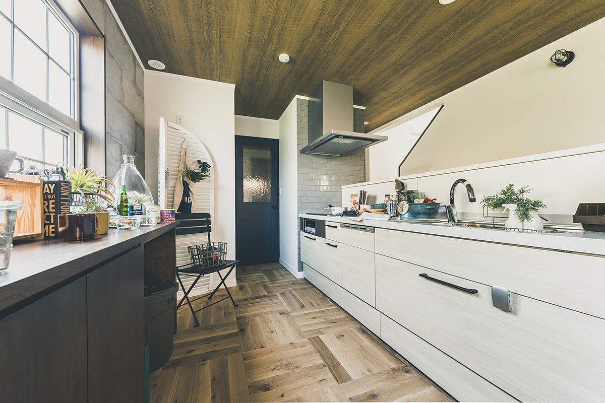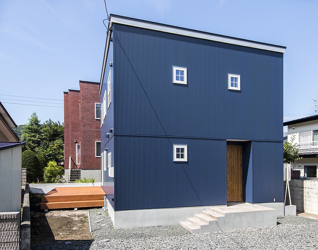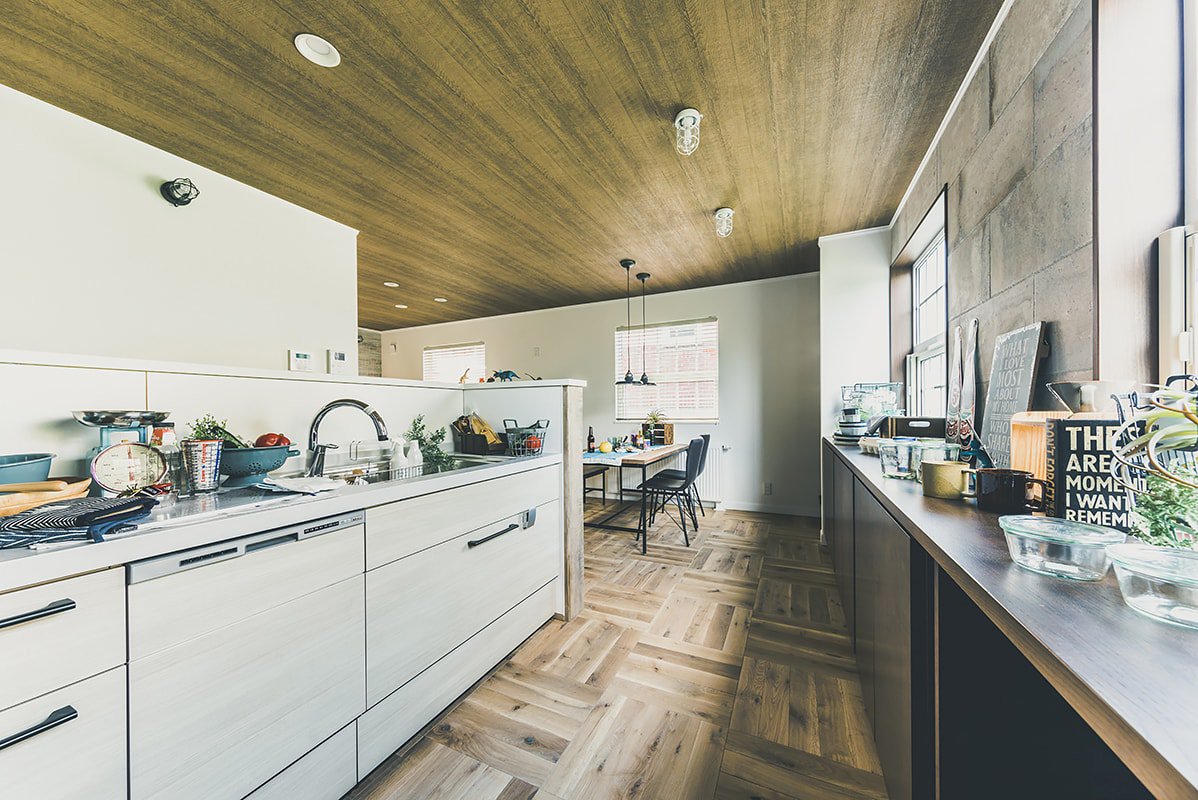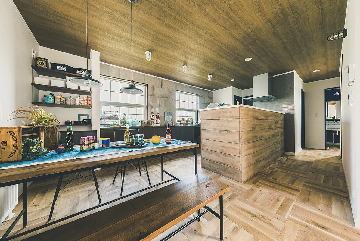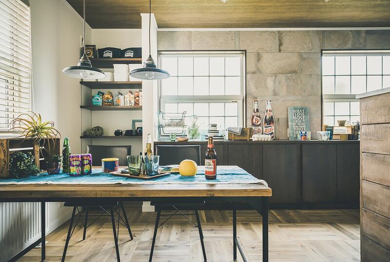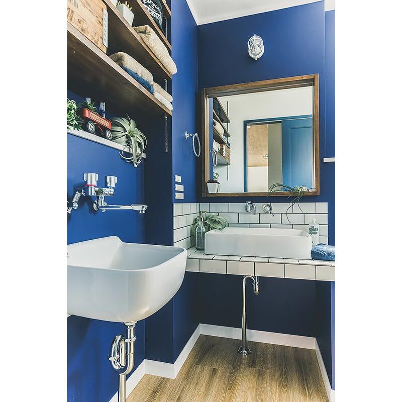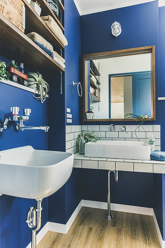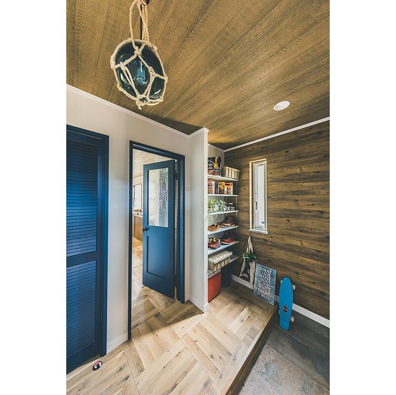 家の真ん中の吹き抜け部分に設けたデッキのようなくつろぎスペース。インテリアはブルーをアクセントにしたマリンテイスト。石やタイルの存在感がカッコいい家。