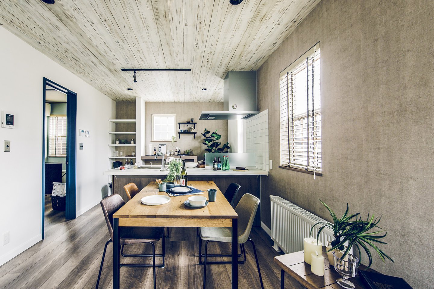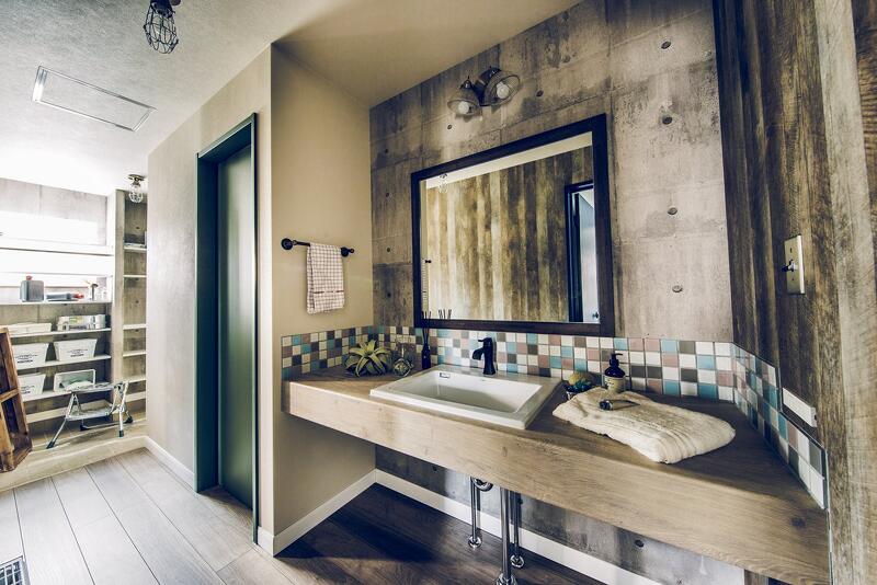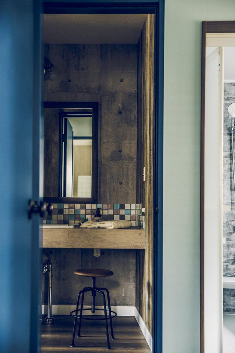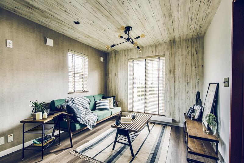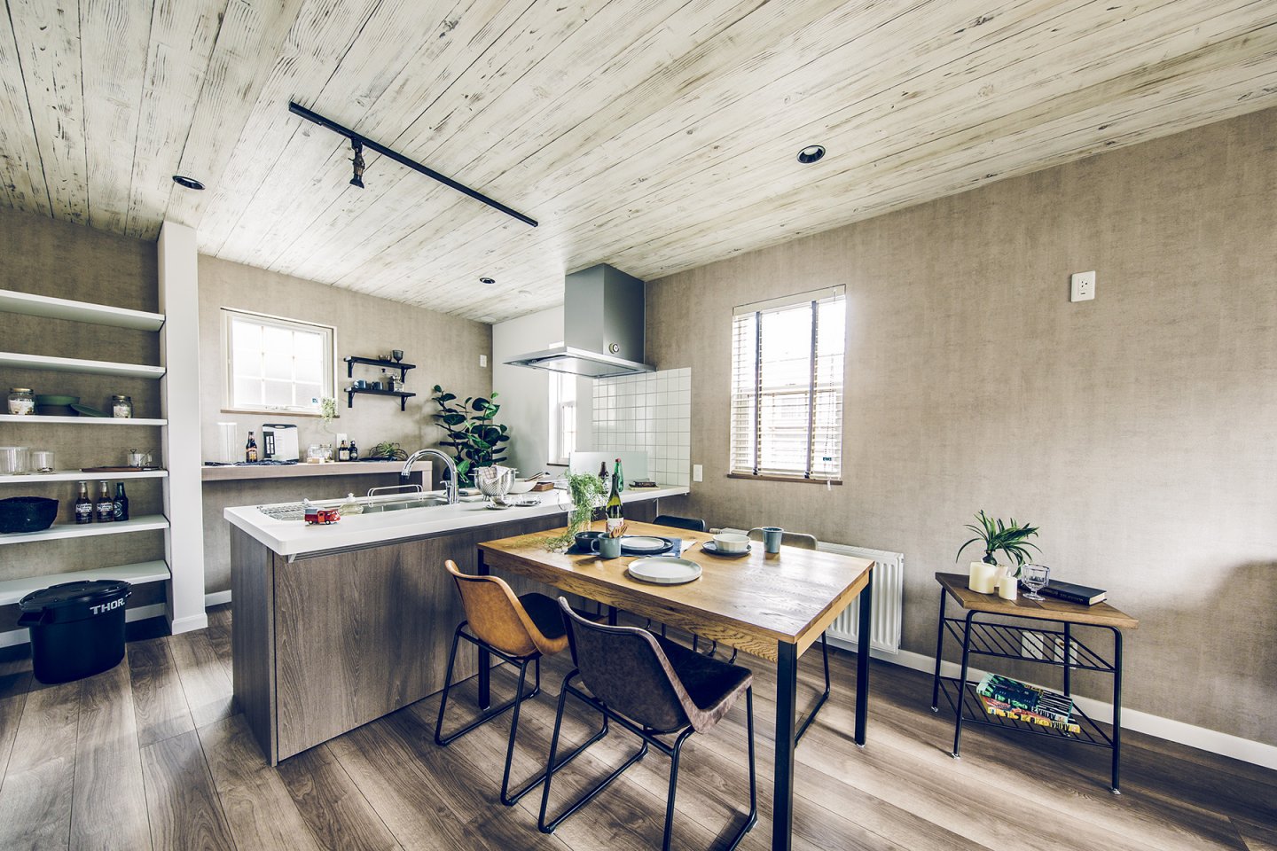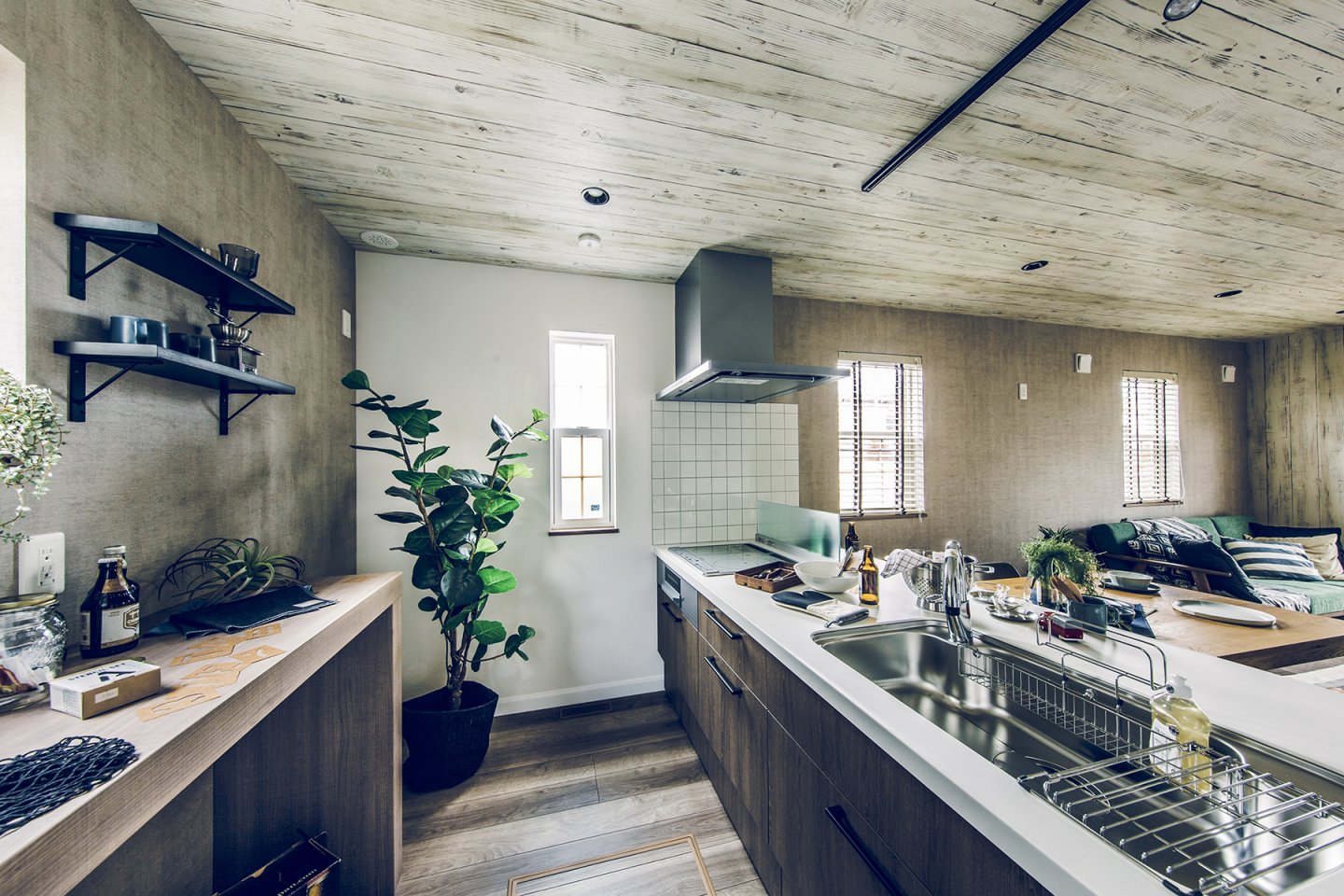 車とバイク2台を停められるスペースを確保した、奥行き7.2mの広々ガレージ。1階は階段を中心とした、キッチン、UT、パウダールームを回遊できる効率の良い間取り。ホワイト系の木目とコンクリート風クロスで、ヴィンテージ感のある空間に。