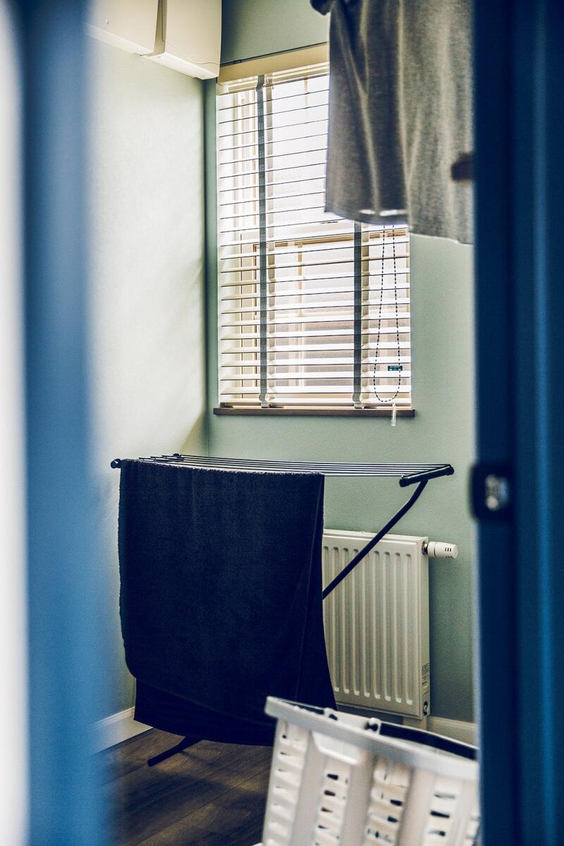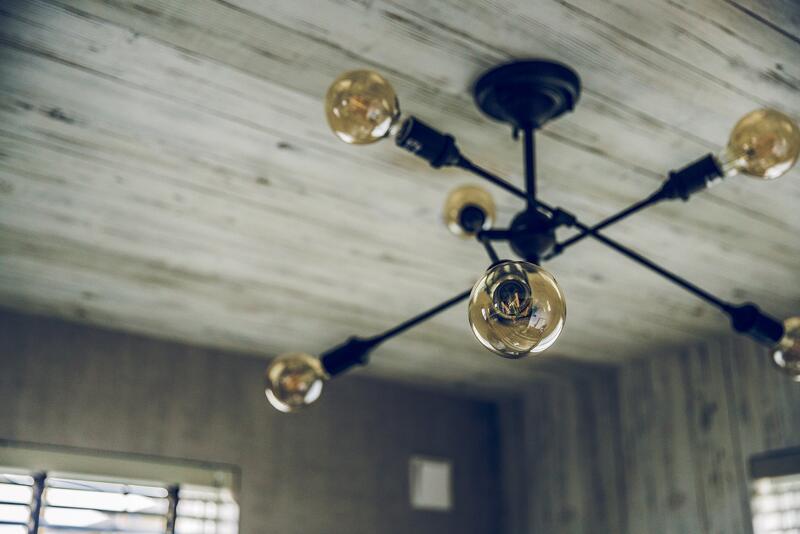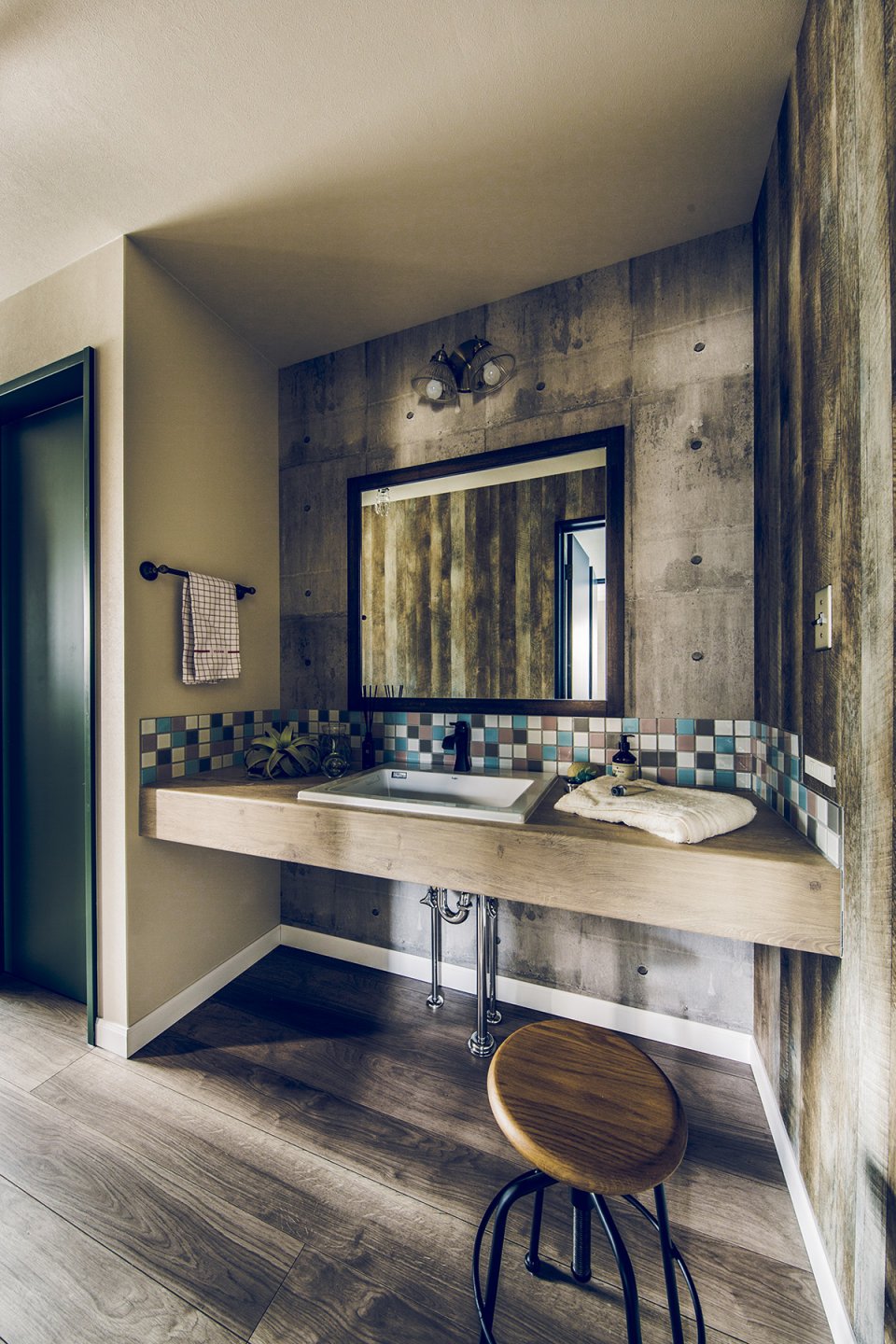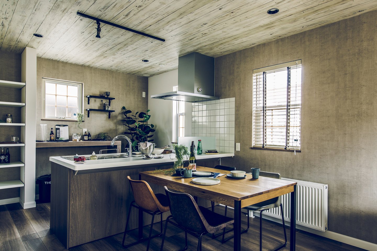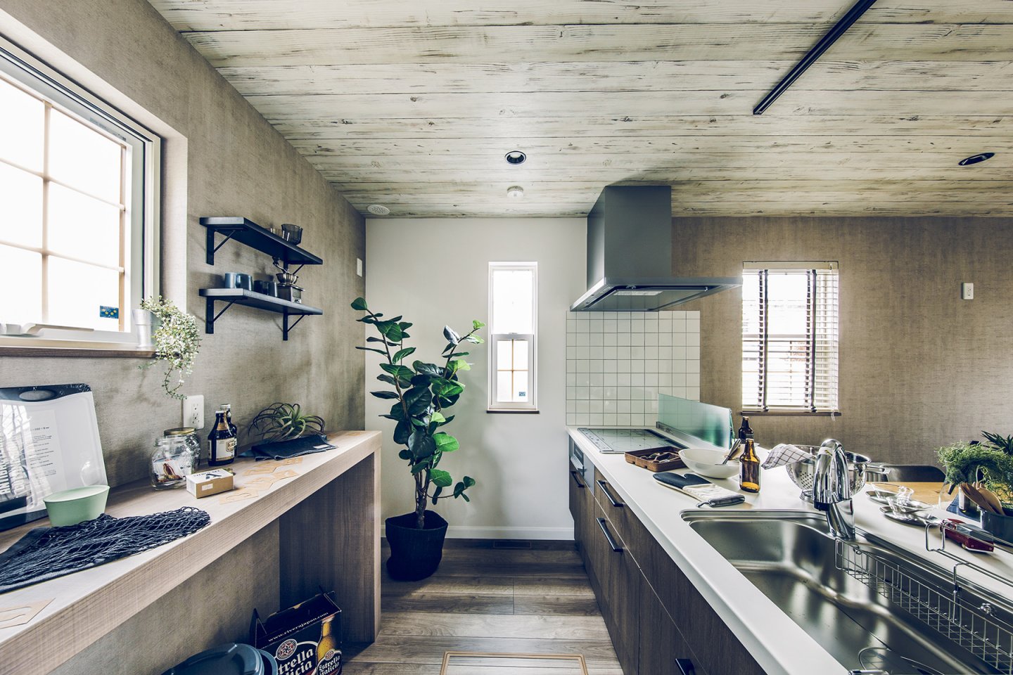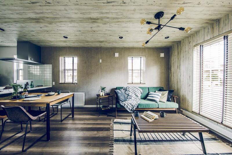 車とバイク2台を停められるスペースを確保した、奥行き7.2mの広々ガレージ。1階は階段を中心とした、キッチン、UT、パウダールームを回遊できる効率の良い間取り。ホワイト系の木目とコンクリート風クロスで、ヴィンテージ感のある空間に。