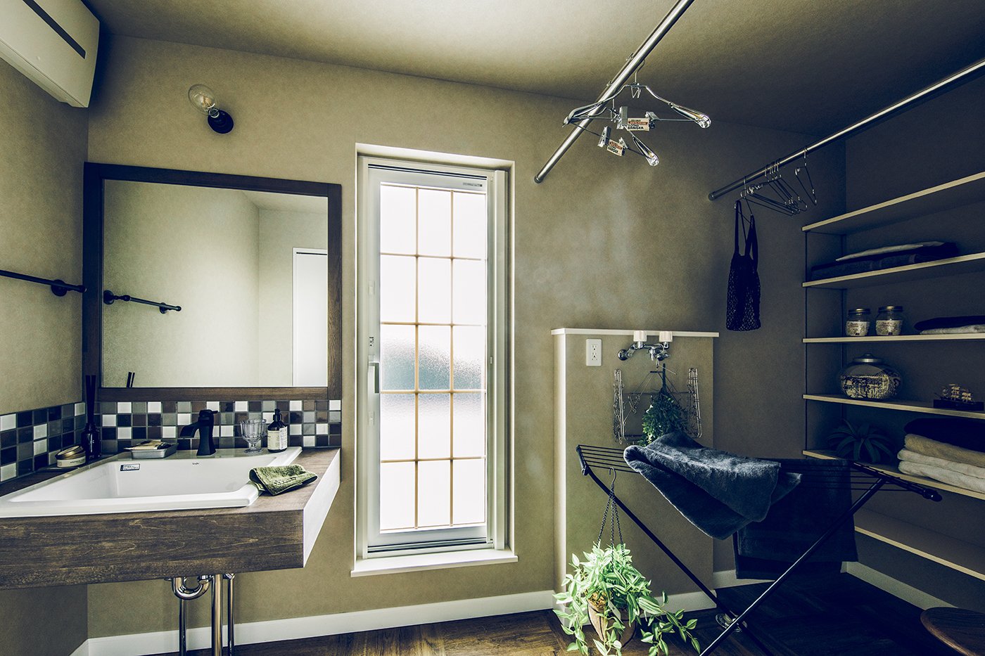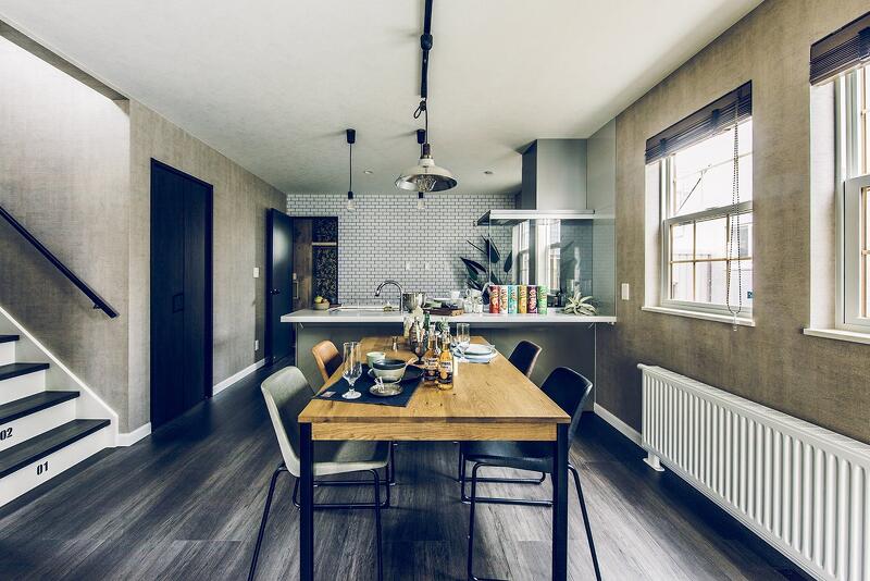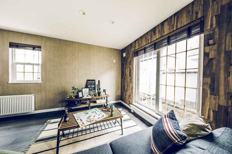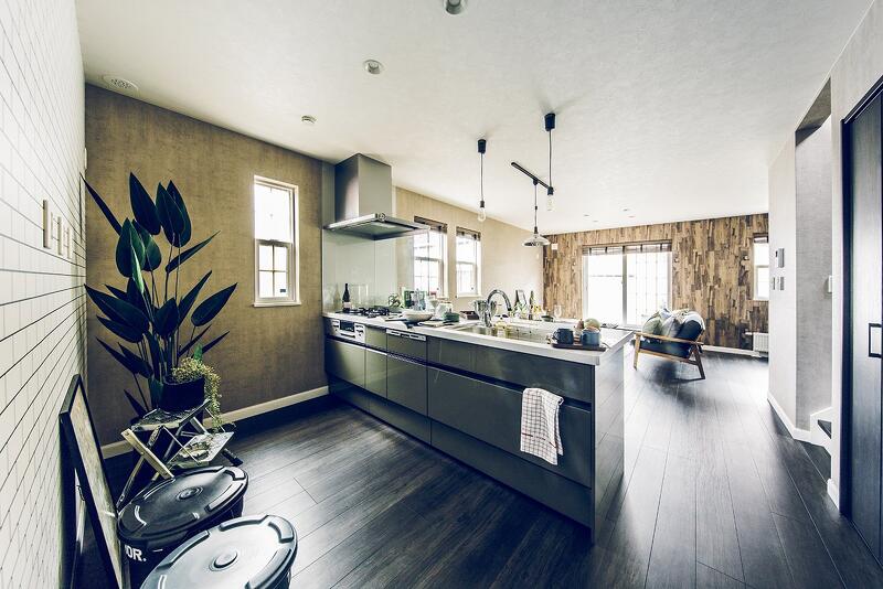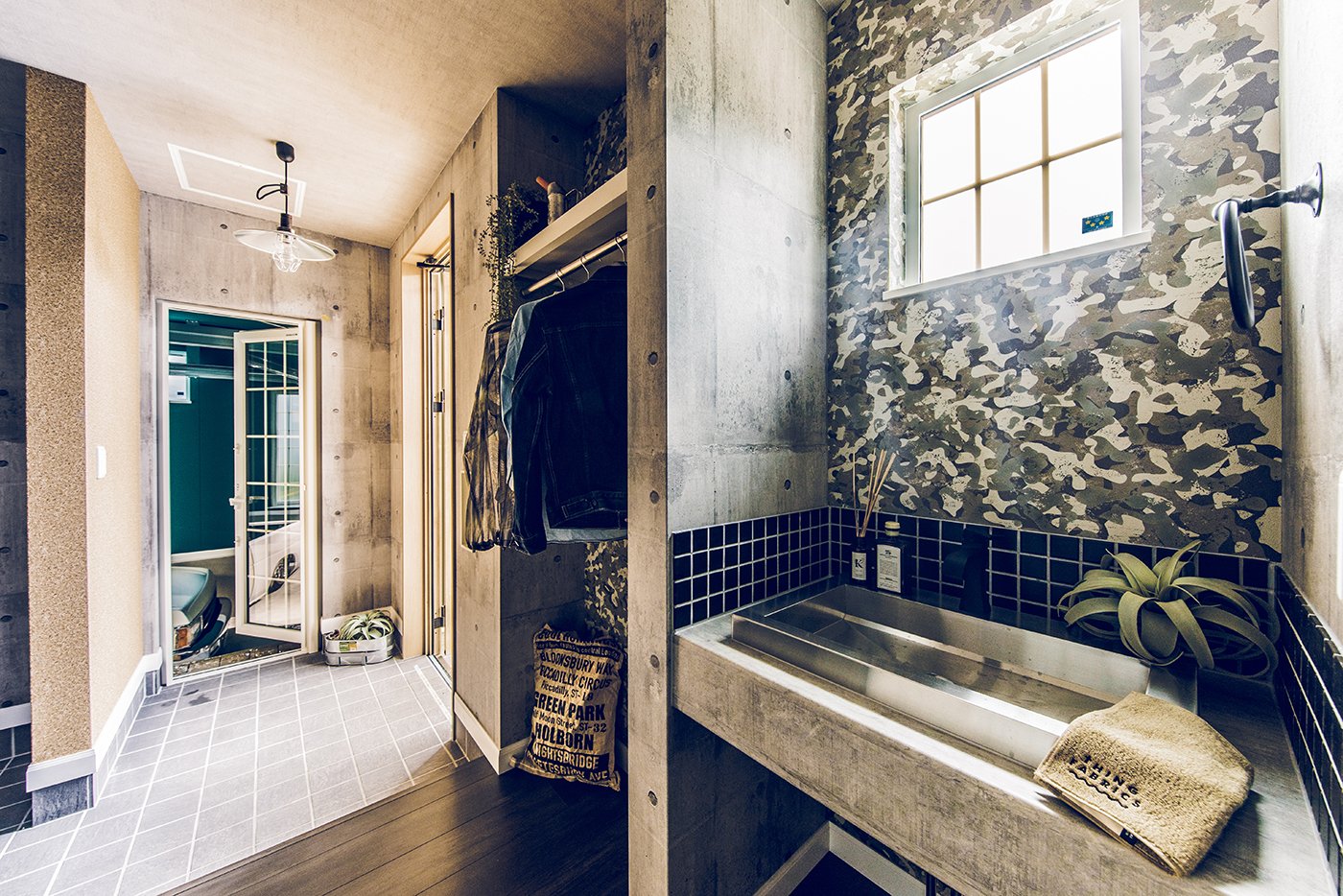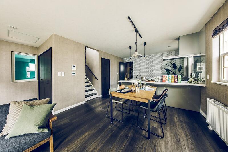 趣味の車いじりに没頭できる、愛車が映える全面グリーンのガレージ。 愛車を身近に感じられるように、ガレージを覗く窓をリビングつけたのもこだわりポイント。 サブウェイタイル柄や木目のクロスがカッコいい空間。 BBQやプール遊び、おうちアウトドアに使えるバルコニーも。