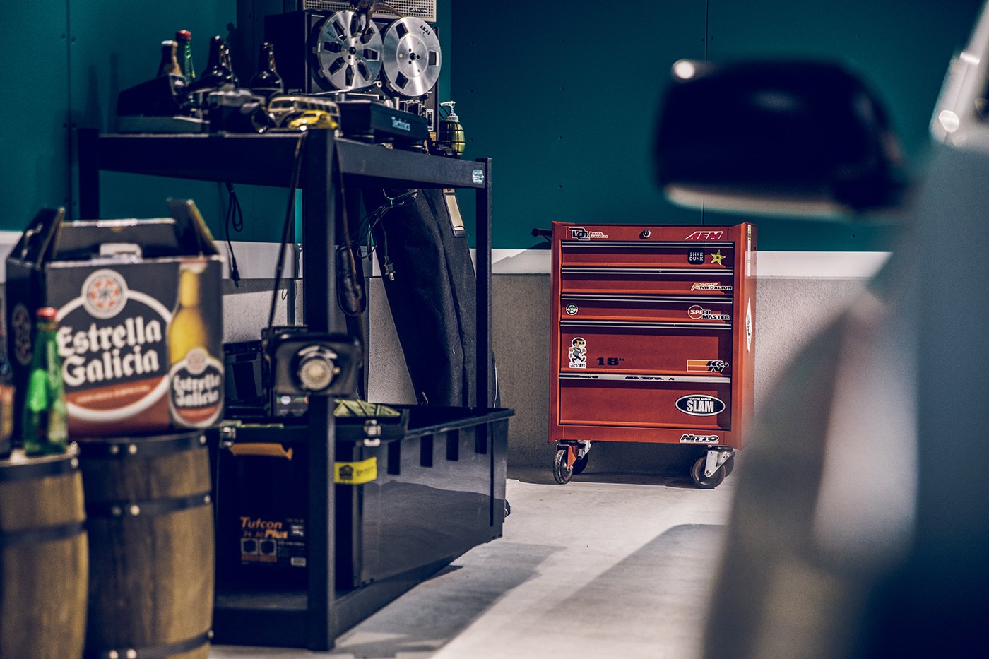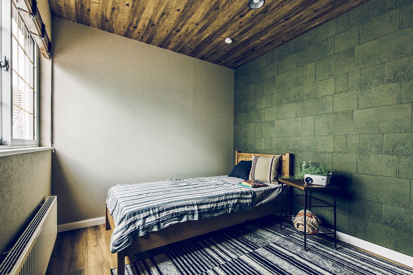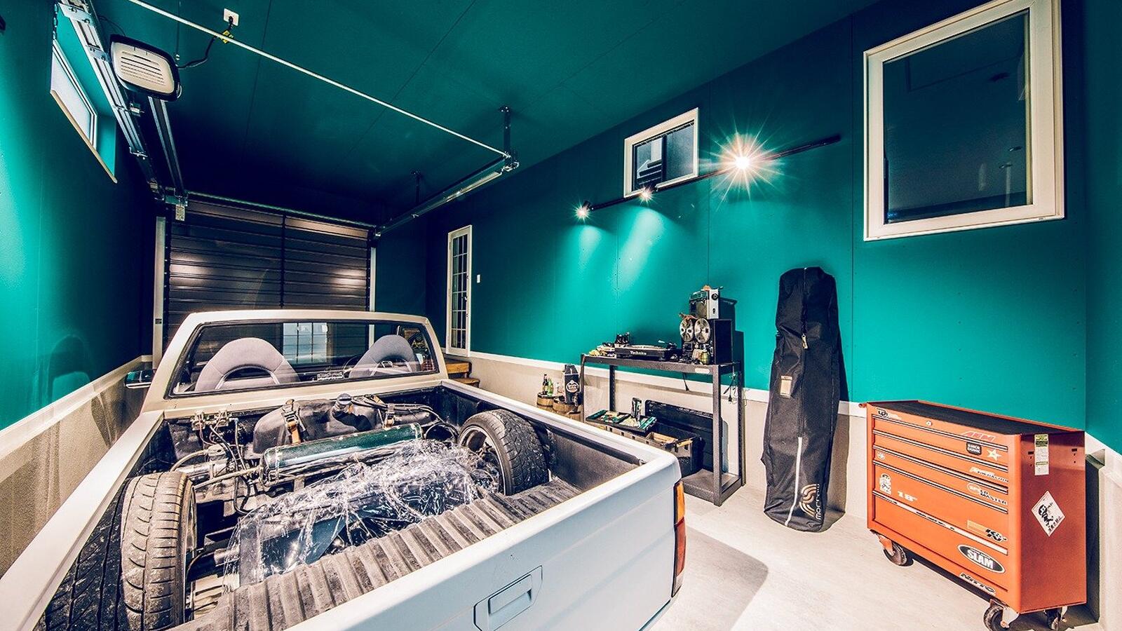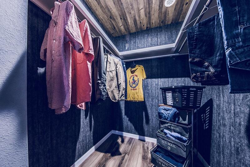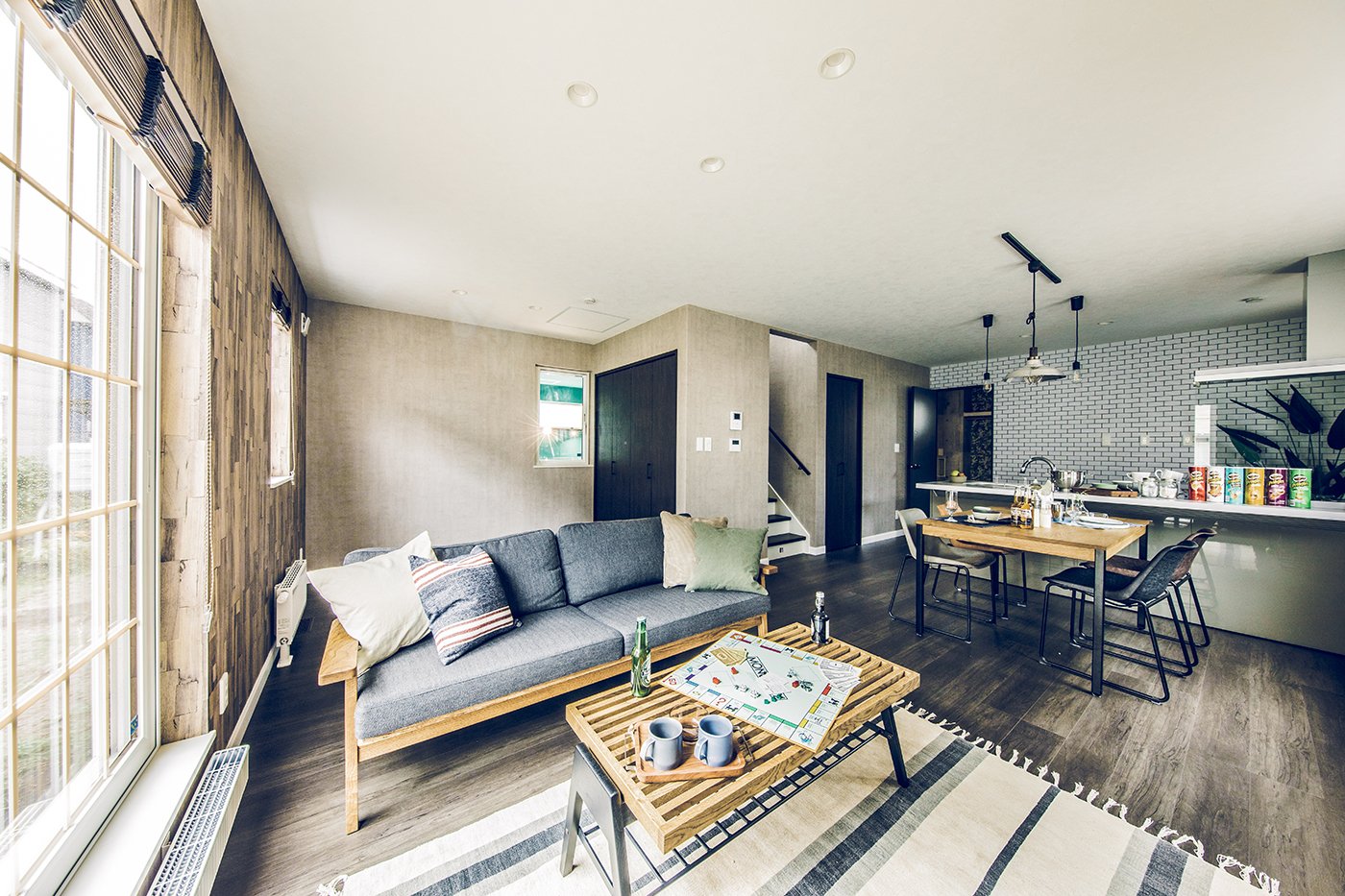 趣味の車いじりに没頭できる、愛車が映える全面グリーンのガレージ。 愛車を身近に感じられるように、ガレージを覗く窓をリビングつけたのもこだわりポイント。 サブウェイタイル柄や木目のクロスがカッコいい空間。 BBQやプール遊び、おうちアウトドアに使えるバルコニーも。
