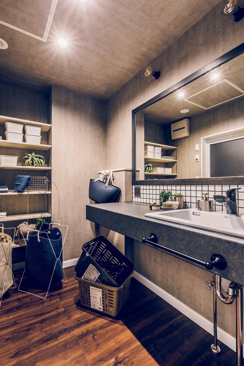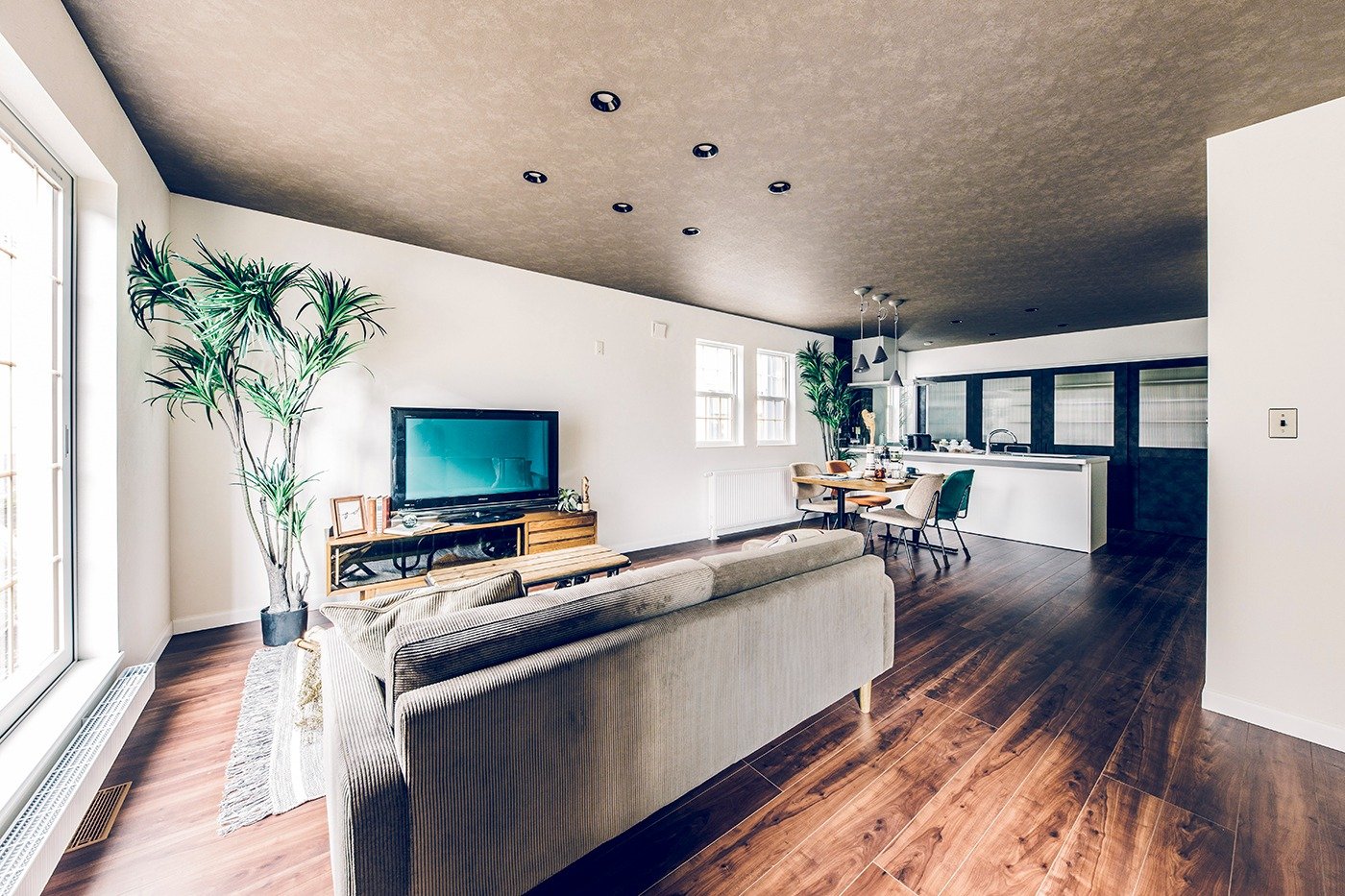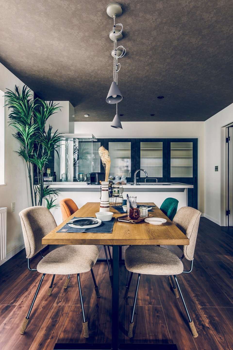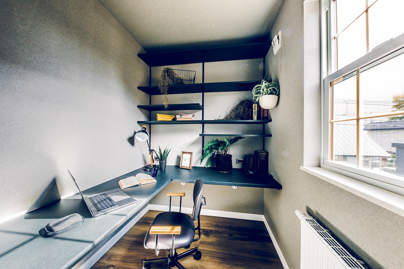 趣味の拠点や仲間との遊び場として使える、全面オレンジのガレージ。 アイアンの室内窓やキッチン背面の引き違い戸が映えるシンプルビンテージな空間。 洗濯物干しはもちろん、おうちアウトドアにも使えるバルコニー。 造作カウンターとコレクション用の棚を付けたテレワーク対応の書斎スペース。