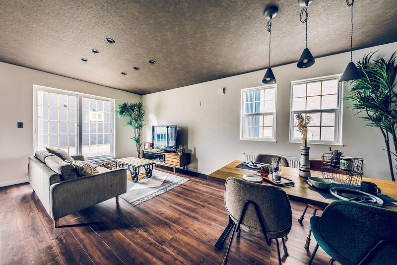 白×グレーにアイアンの黒が映える、シンプルビンテージなガレージハウス