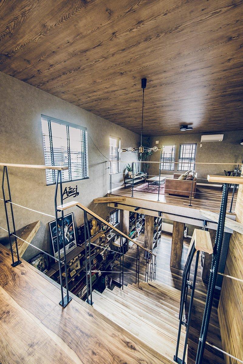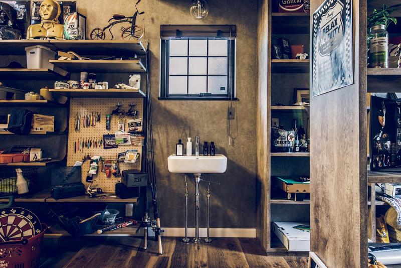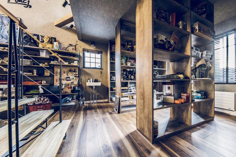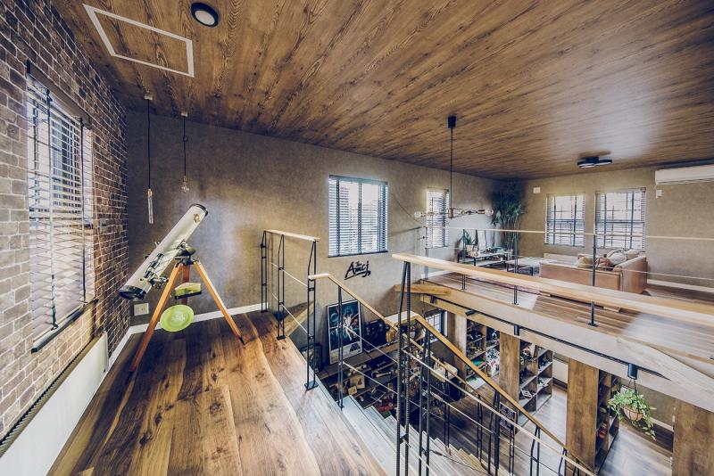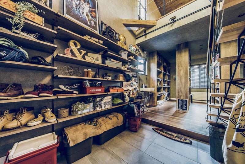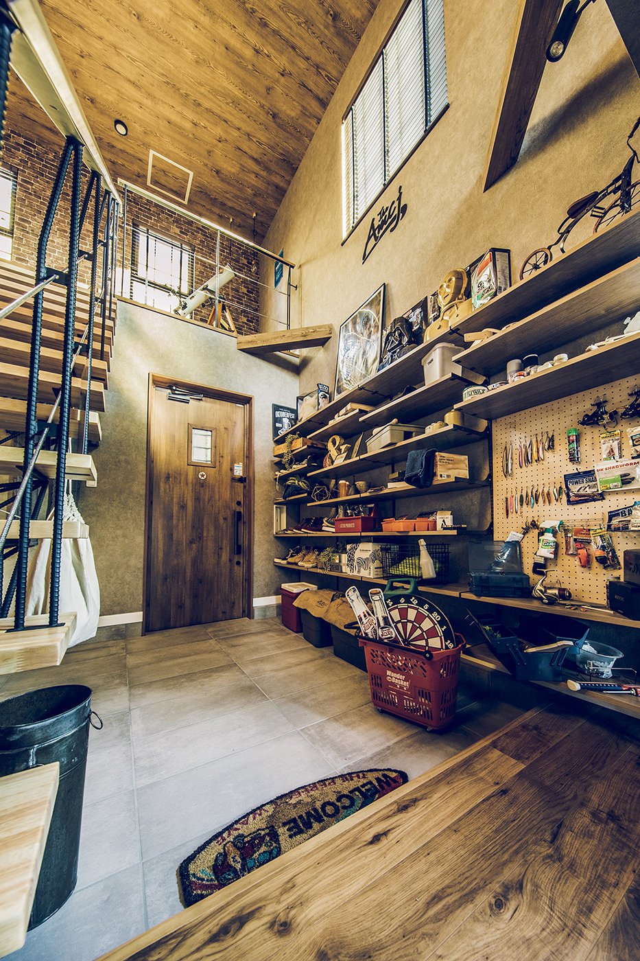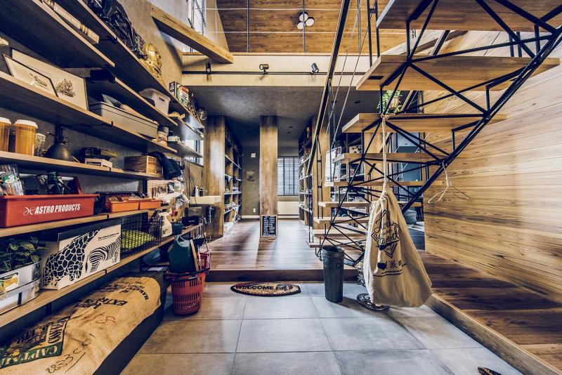 趣味や遊びにさまざまな使い方ができる広い土間と収納スペース。 玄関上部の吹き抜けと視線の抜ける開放感をもたらすさらし階段。 土間の奥は収納棚を設置したフリースペース。アクティビティの道具やコレクションをディスプレイ。 2階のホールにはテレワークにも対応するワークスペースを。 木目とブラウン系のコーディネートは、落ち着いたカッコよさをつくります。
