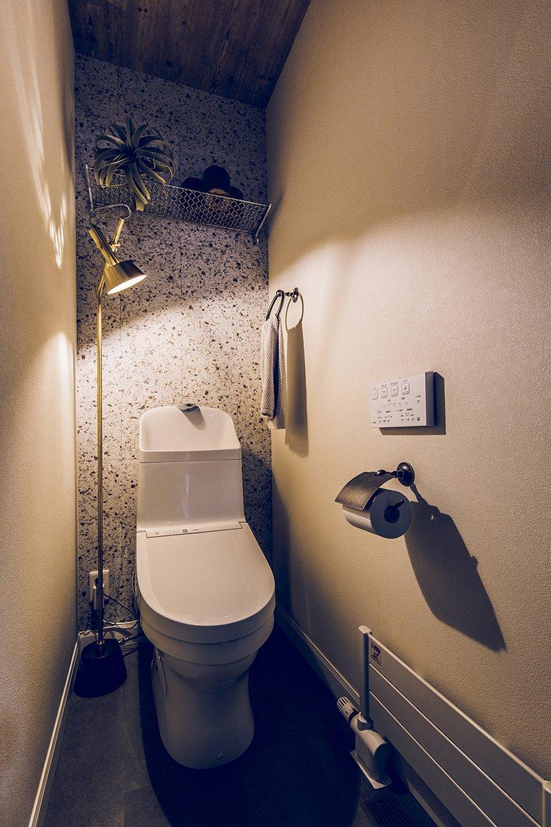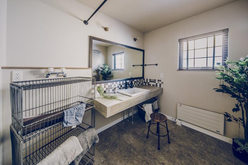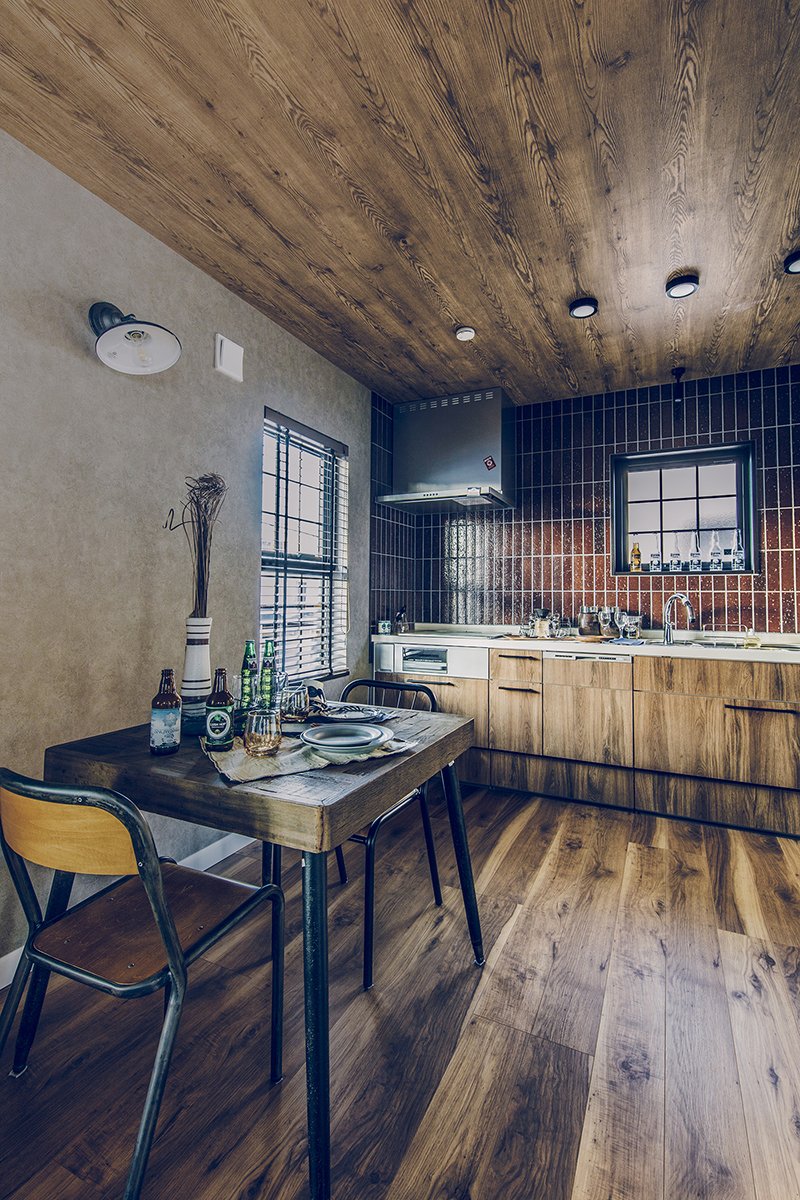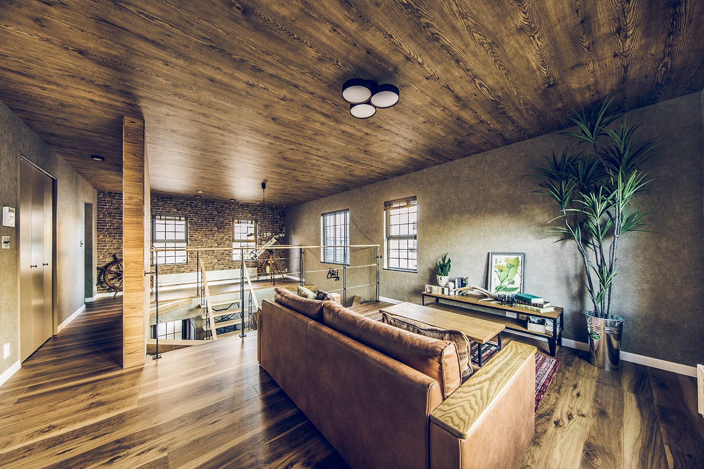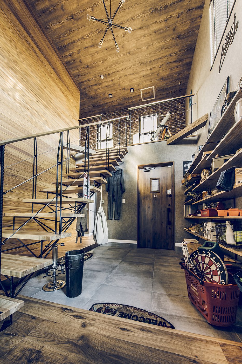 趣味や遊びにさまざまな使い方ができる広い土間と収納スペース。 玄関上部の吹き抜けと視線の抜ける開放感をもたらすさらし階段。 土間の奥は収納棚を設置したフリースペース。アクティビティの道具やコレクションをディスプレイ。 2階のホールにはテレワークにも対応するワークスペースを。 木目とブラウン系のコーディネートは、落ち着いたカッコよさをつくります。
