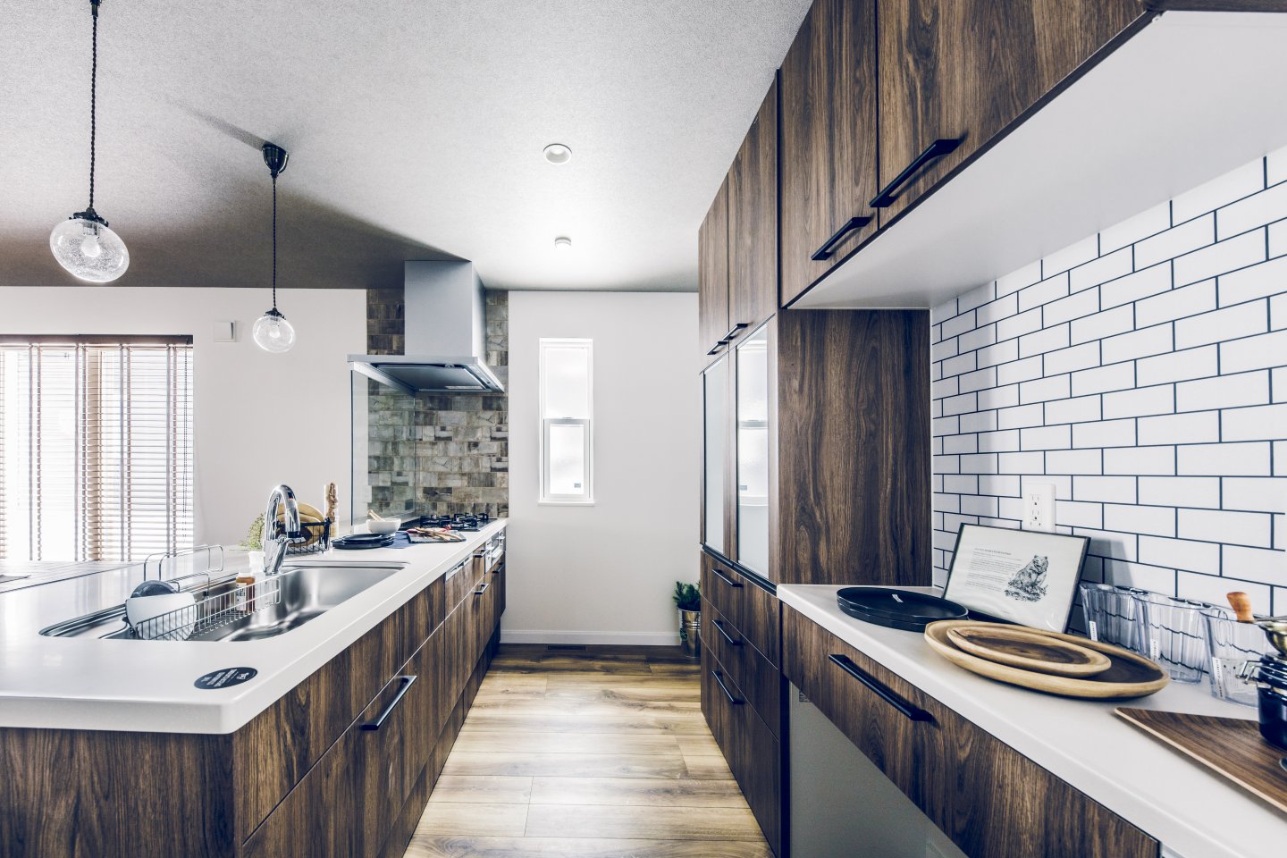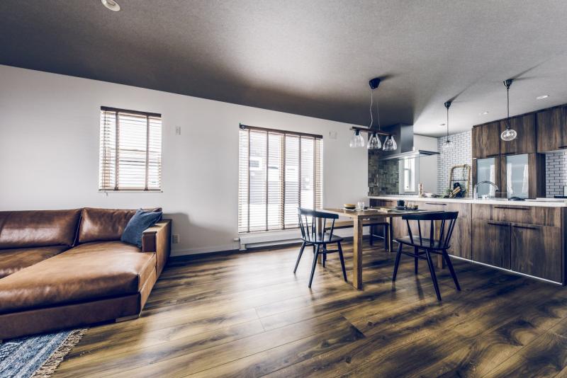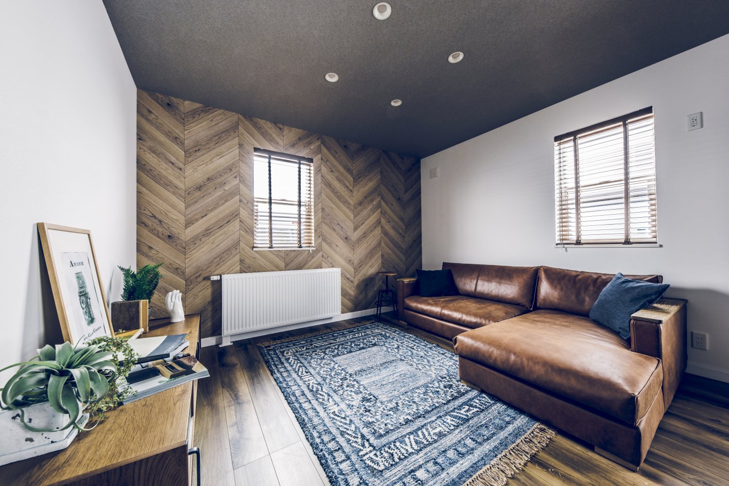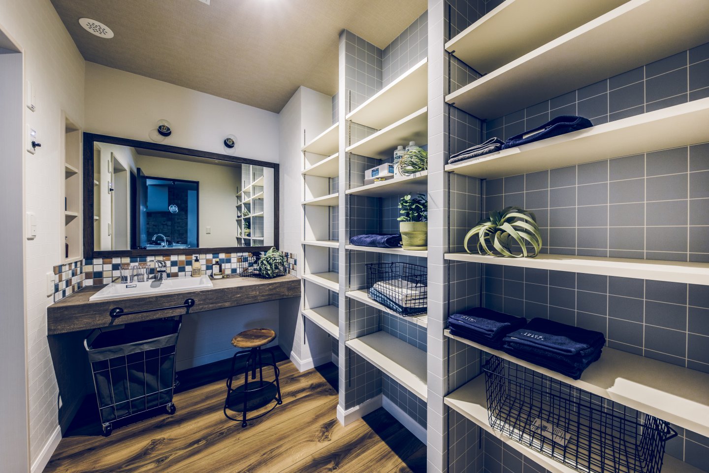 前後のシャッターで趣味の車とバイクの出し入れも楽々なガレージ。 タイルとヘリンボーン柄のクロス使いで落ち着いた雰囲気の広々リビングダイニング。 独立したランドリールームと大型ウォークインクローゼットで洗濯家事の効率UP! 玄関横の手洗いスペースで感染対策も万全。