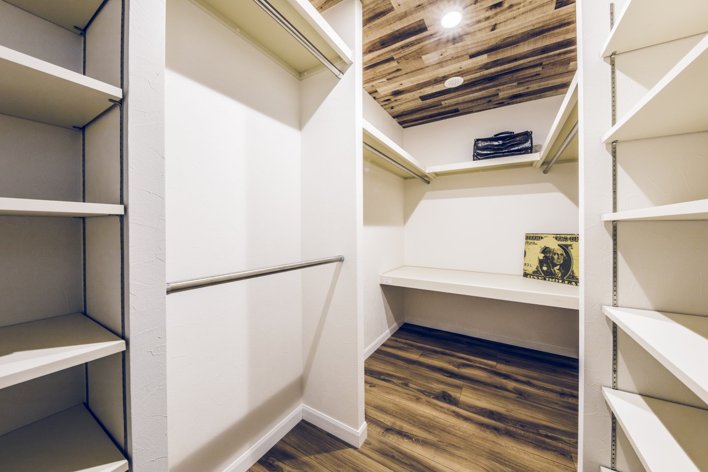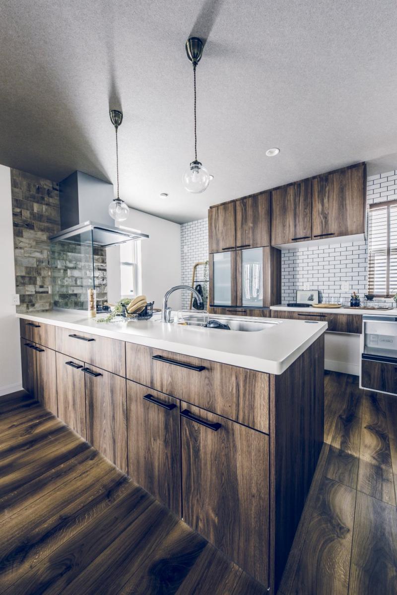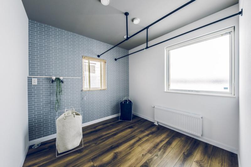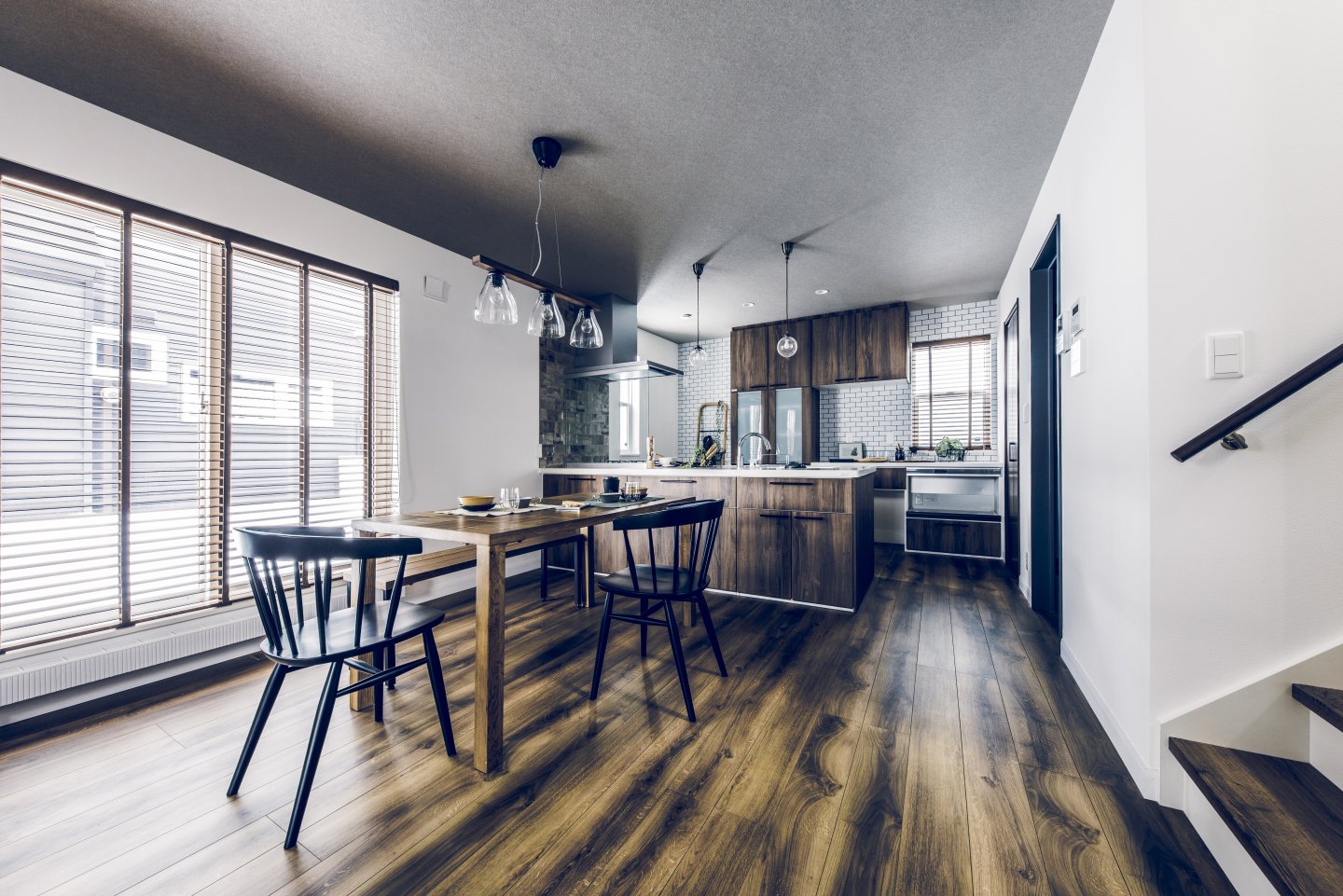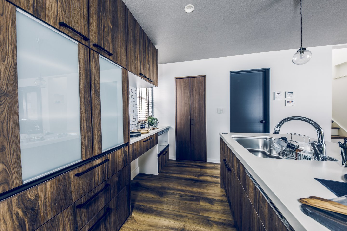前後のシャッターで趣味の車とバイクの出し入れも楽々なガレージ。 タイルとヘリンボーン柄のクロス使いで落ち着いた雰囲気の広々リビングダイニング。 独立したランドリールームと大型ウォークインクローゼットで洗濯家事の効率UP! 玄関横の手洗いスペースで感染対策も万全。