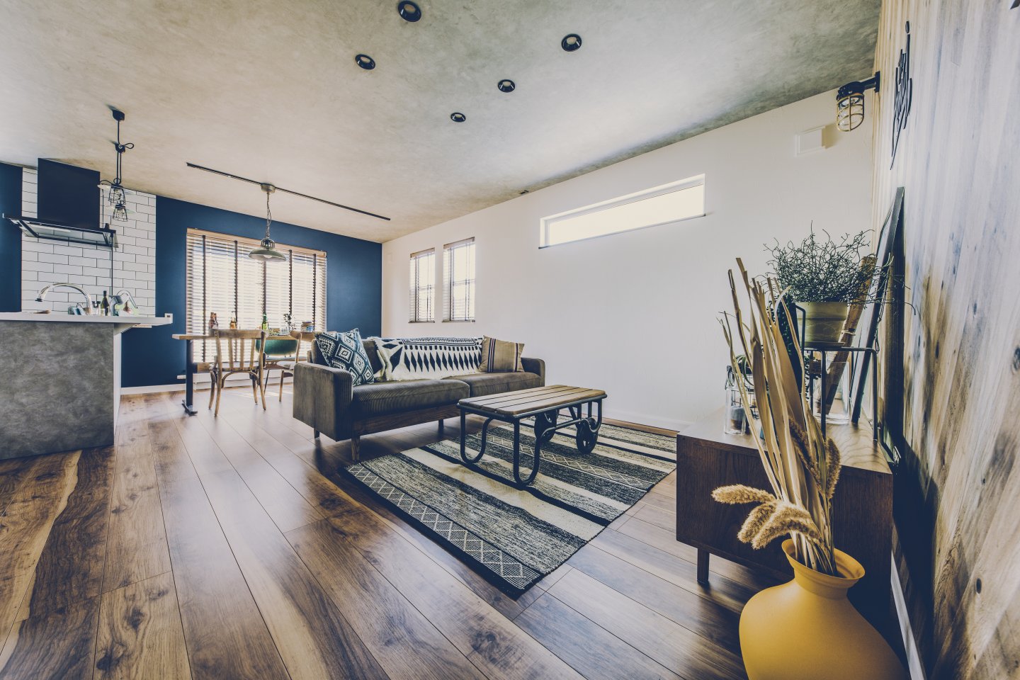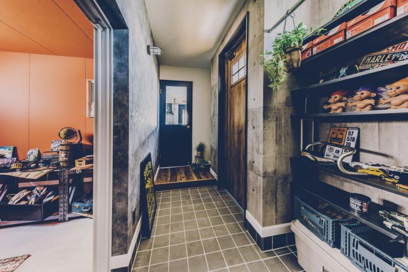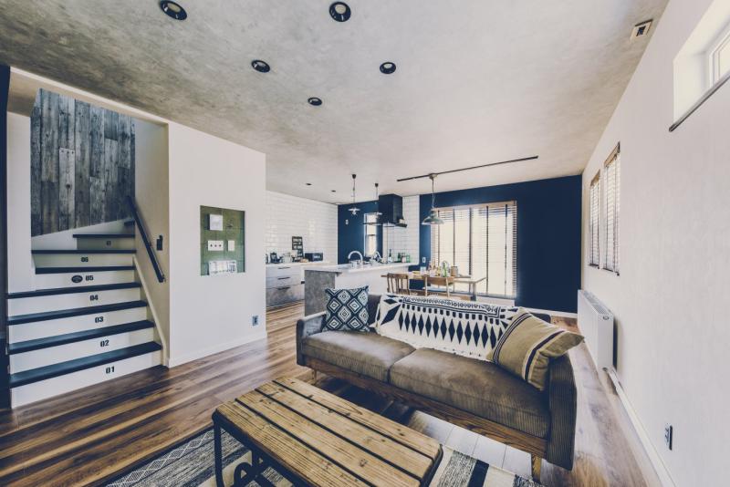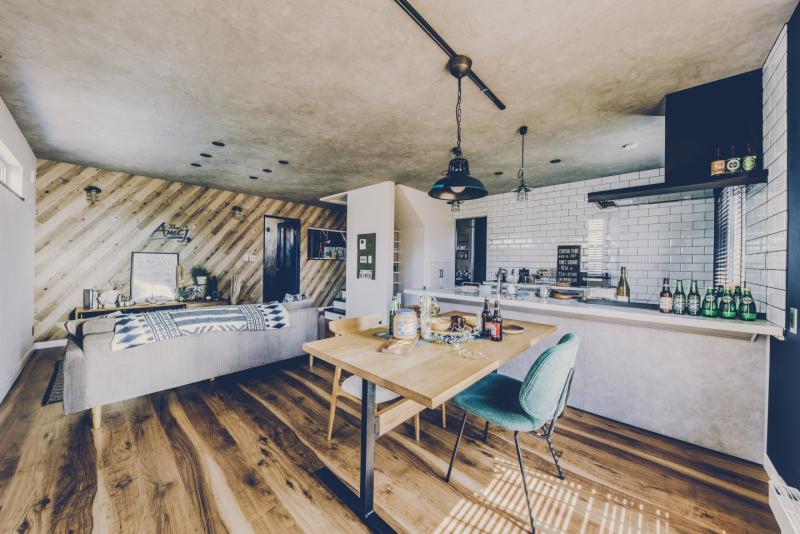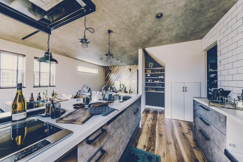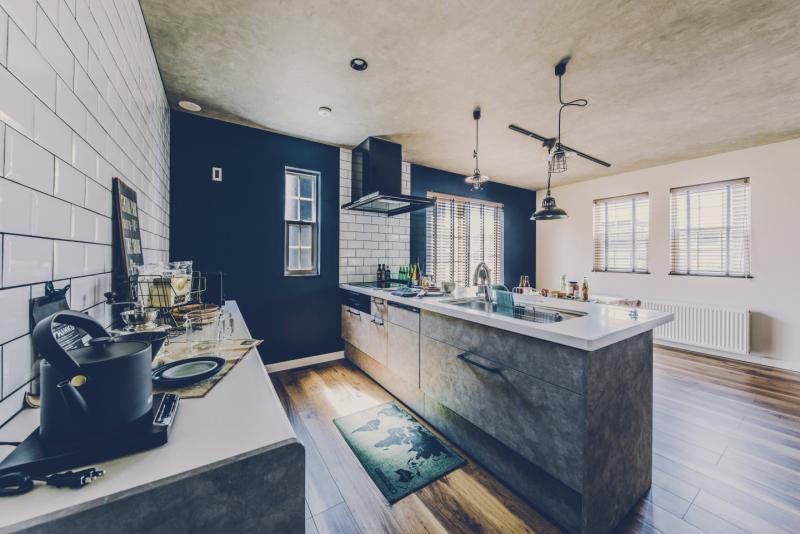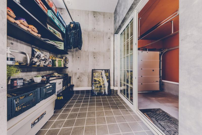 車いじりや趣味の道具のメンテナンスに没頭できるガレージ。 リビングからガレージを覗ける窓をつけて愛車を身近に。 BBQやおうちアウトドアを楽しめる大型バルコニー。 木目やコンクリート柄のクロスやキッチン背面のタイル貼りがカッコいい空間。