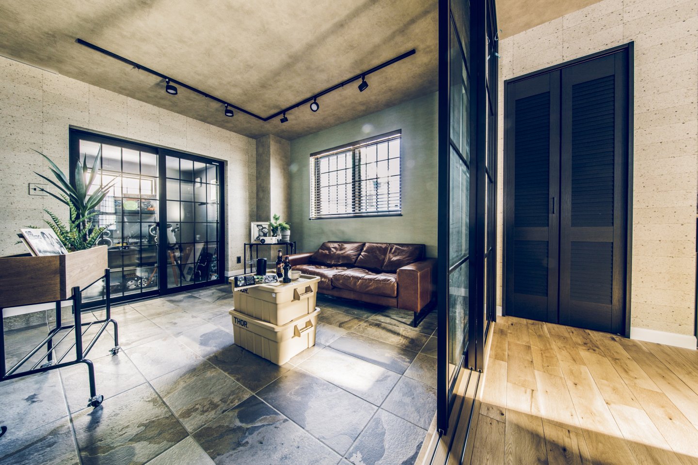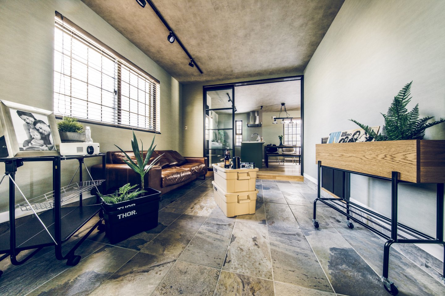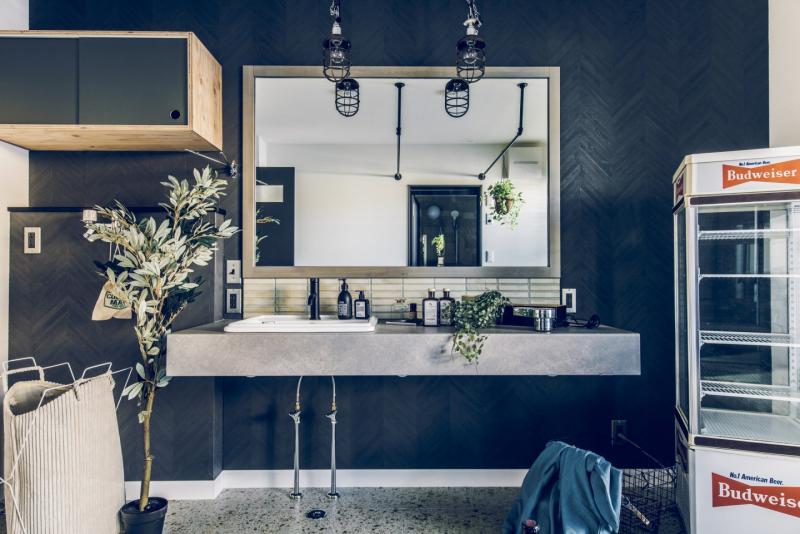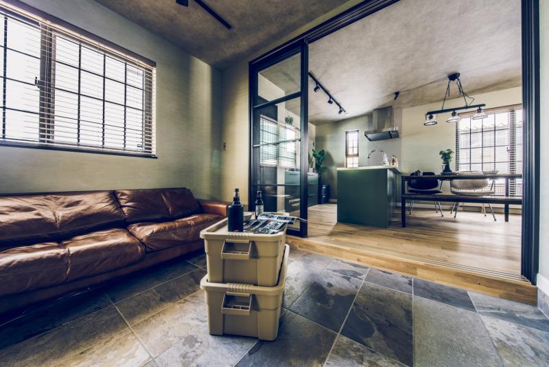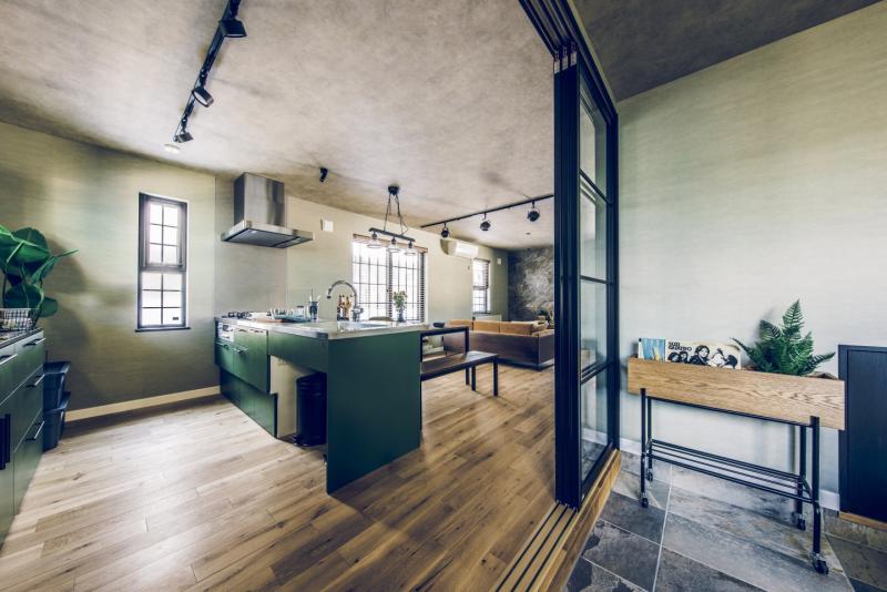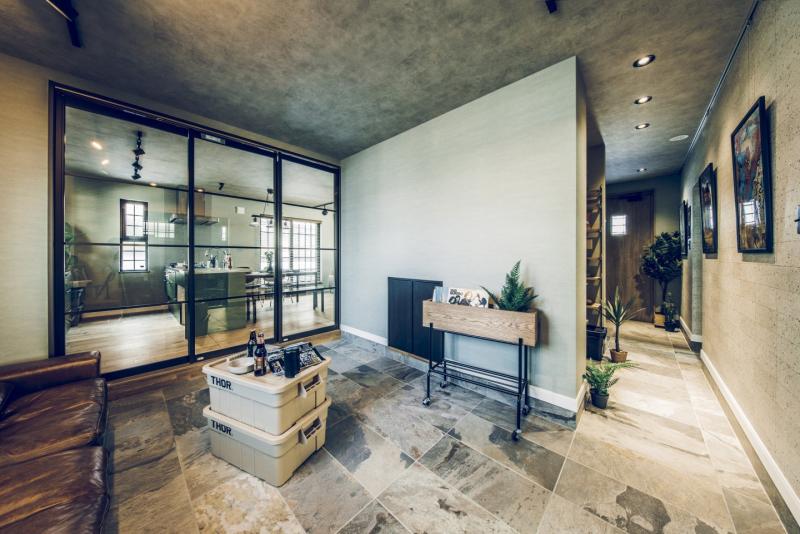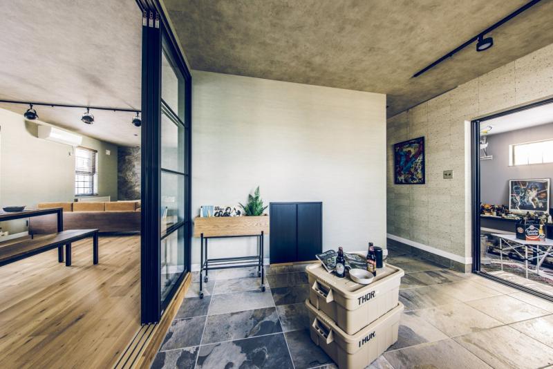 コンクリート打ちっぱなしのようなカッコいいガレージは、車をいじったり、工具をしまったり、車好きにはたまらない空間。 ガレージとリビングを繋ぐ土間スペースは、少しくらい汚れても気にならない、大人の遊び場。昼間は庭でBBQして、夜は土間で二次会なんてことも。リビングダイニングは、落ち着いた雰囲気の大人なアメカジインテリアな開放的な空間。