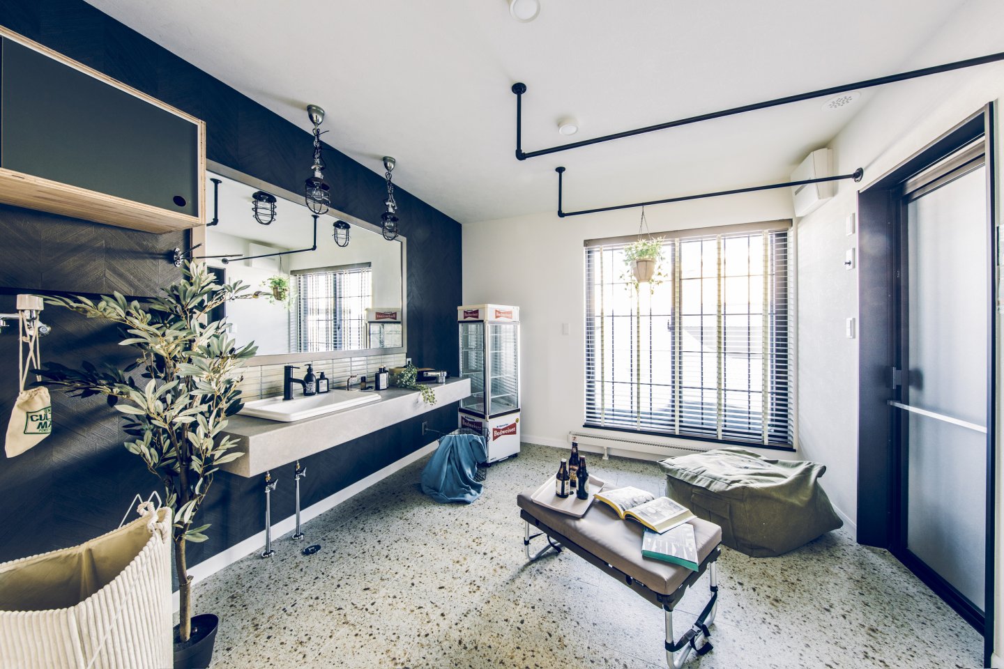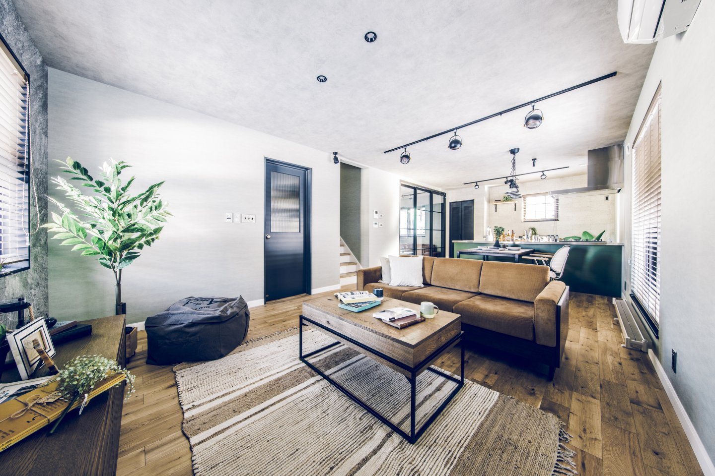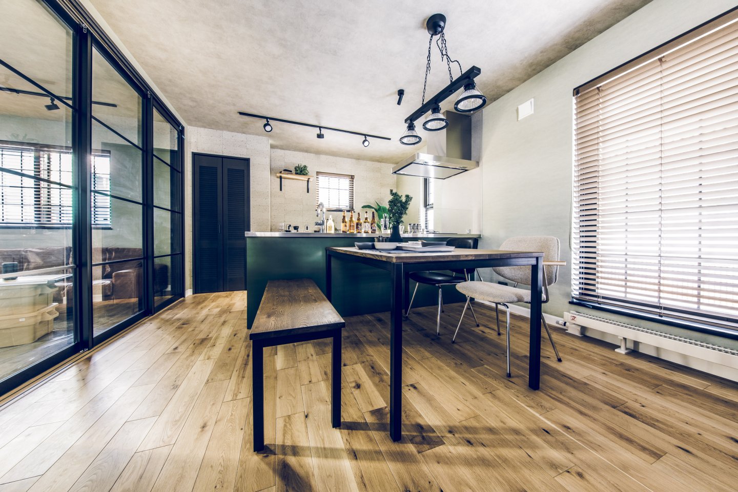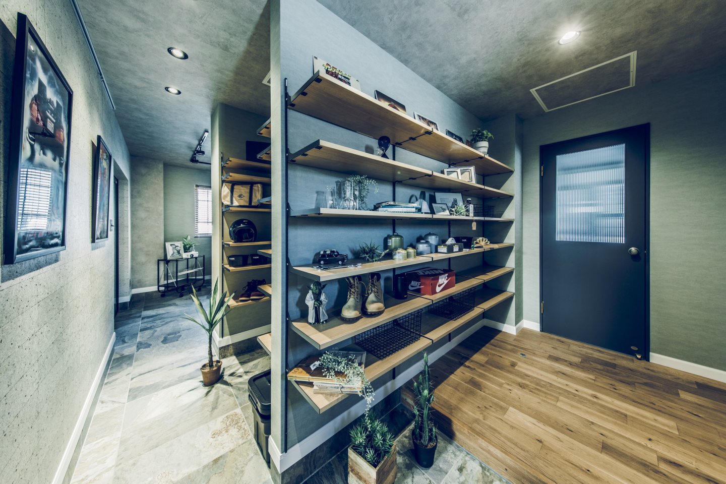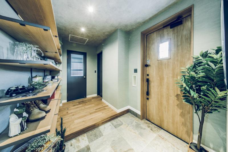 コンクリート打ちっぱなしのようなカッコいいガレージは、車をいじったり、工具をしまったり、車好きにはたまらない空間。 ガレージとリビングを繋ぐ土間スペースは、少しくらい汚れても気にならない、大人の遊び場。昼間は庭でBBQして、夜は土間で二次会なんてことも。リビングダイニングは、落ち着いた雰囲気の大人なアメカジインテリアな開放的な空間。