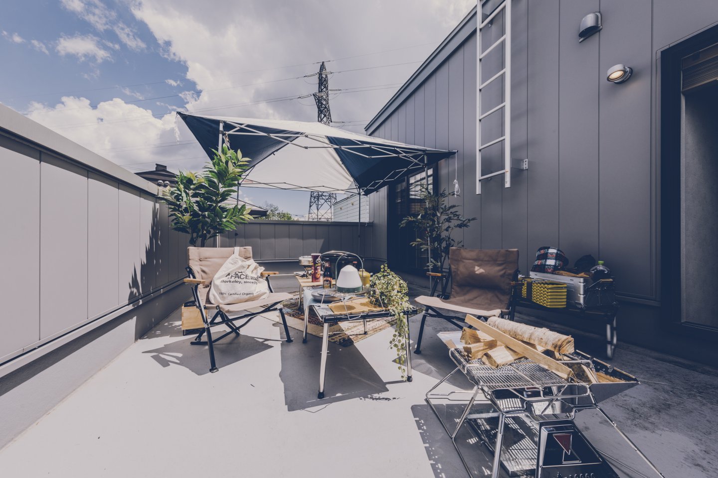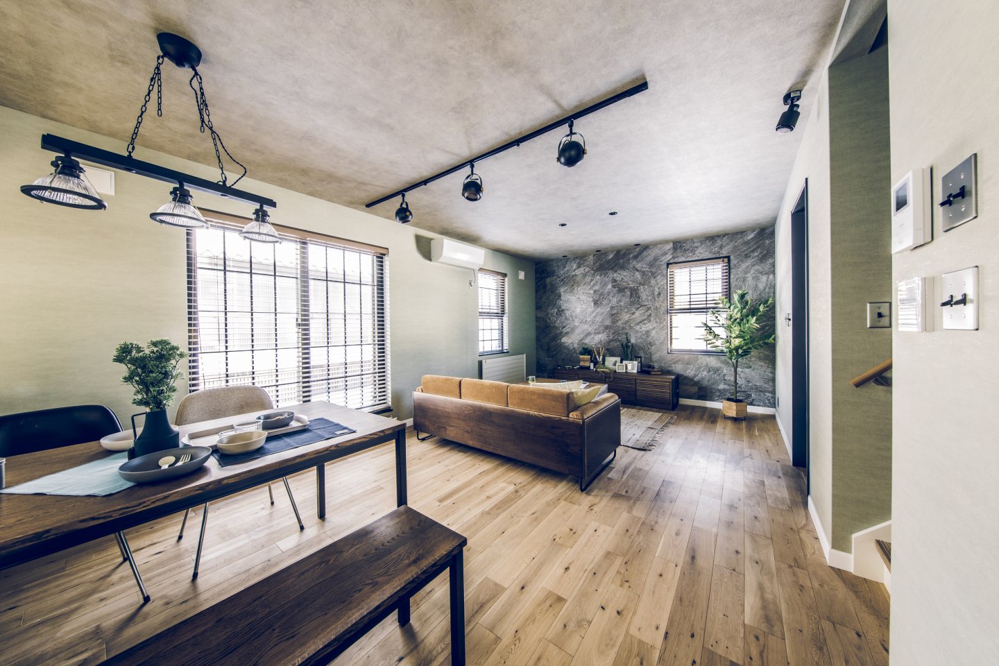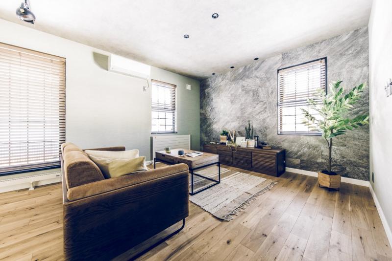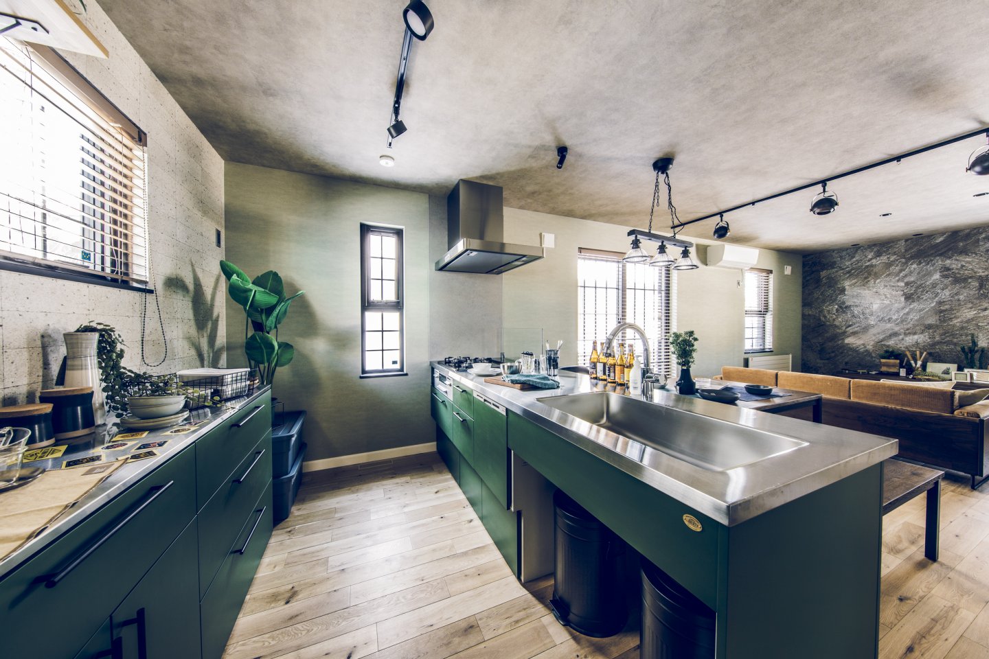 コンクリート打ちっぱなしのようなカッコいいガレージは、車をいじったり、工具をしまったり、車好きにはたまらない空間。 ガレージとリビングを繋ぐ土間スペースは、少しくらい汚れても気にならない、大人の遊び場。昼間は庭でBBQして、夜は土間で二次会なんてことも。リビングダイニングは、落ち着いた雰囲気の大人なアメカジインテリアな開放的な空間。