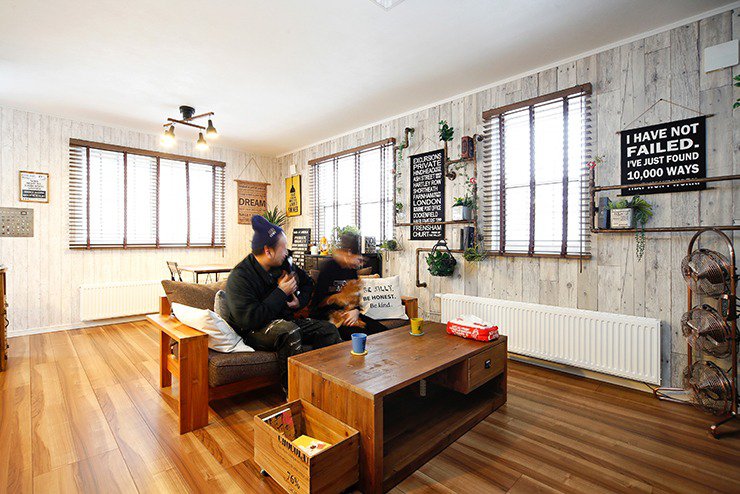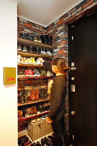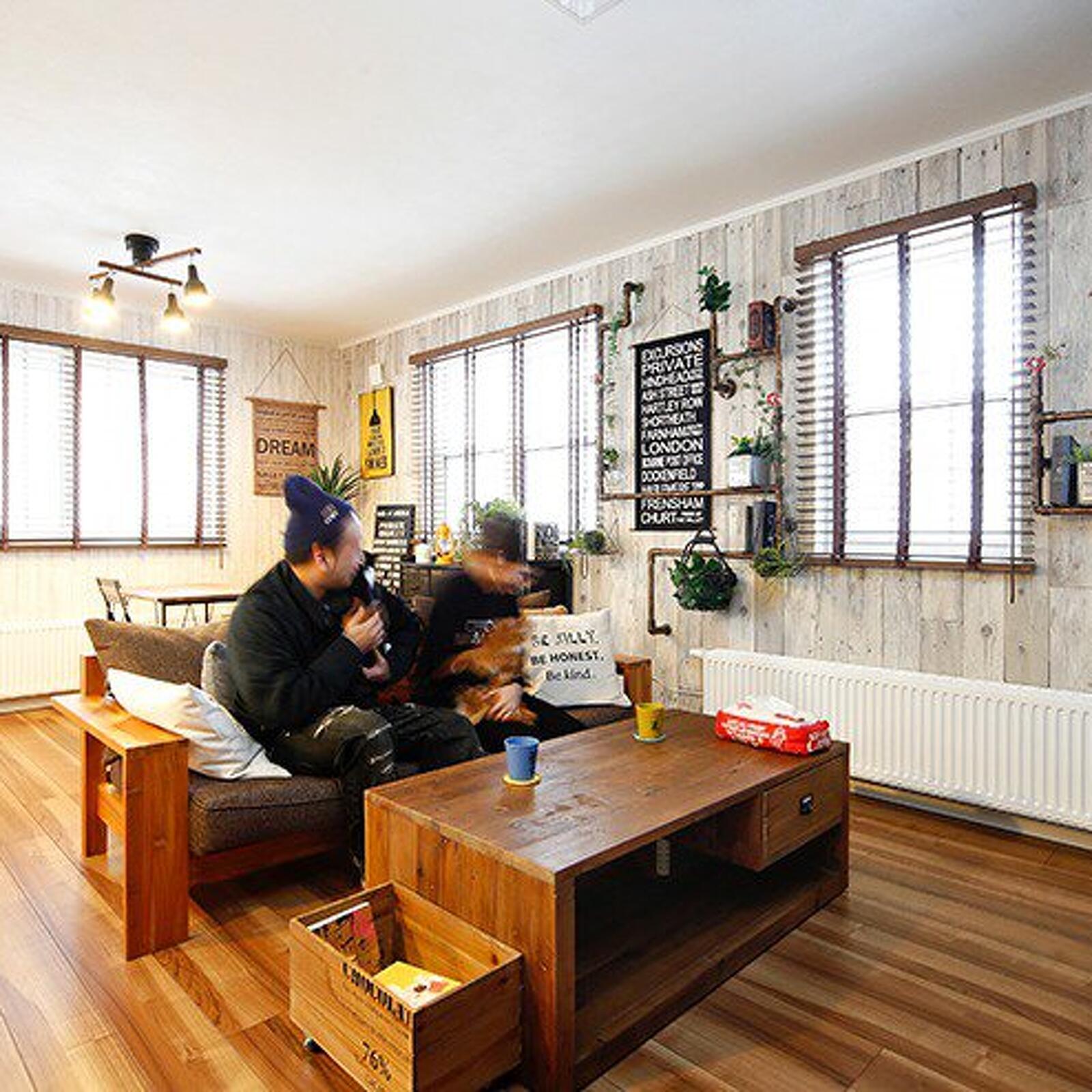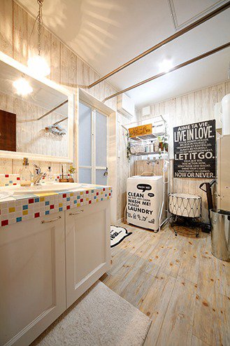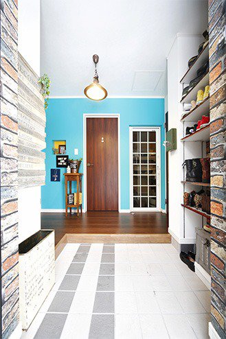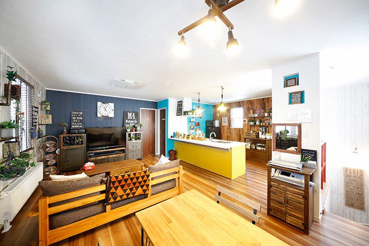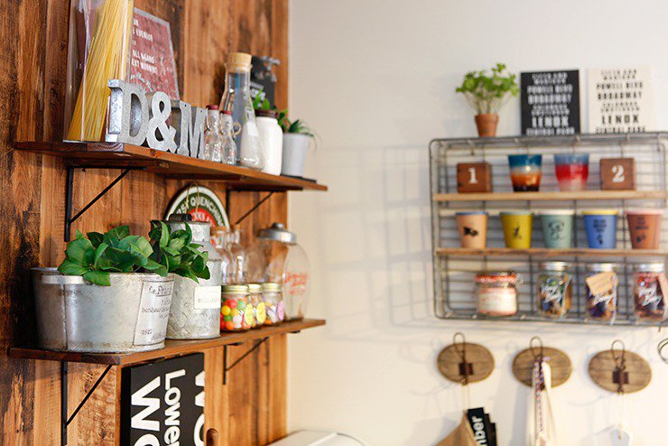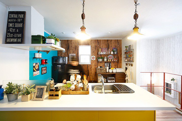 インテリアは、好みのヴィンテージなテイストでまとめた感じですね。コーディネーターさんに提案をもらったり、自分たちで考えたり、まず思いきり壁紙で遊んで。キッチンのビビッドな色の組み合わせは妻が決めました。後ろは古材のような壁紙にして、ディスプレーする棚をDIYしました。妻はココが気に入っているみたいです。「住み始めたらいろいろ飾りたくなった」といって、小物を集めたり飾ったりすごく楽しんでいますね。お手本はインテリアのアプリです(笑)。