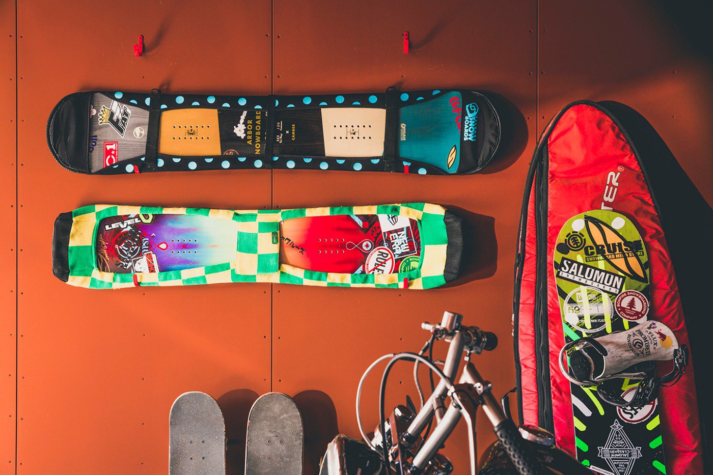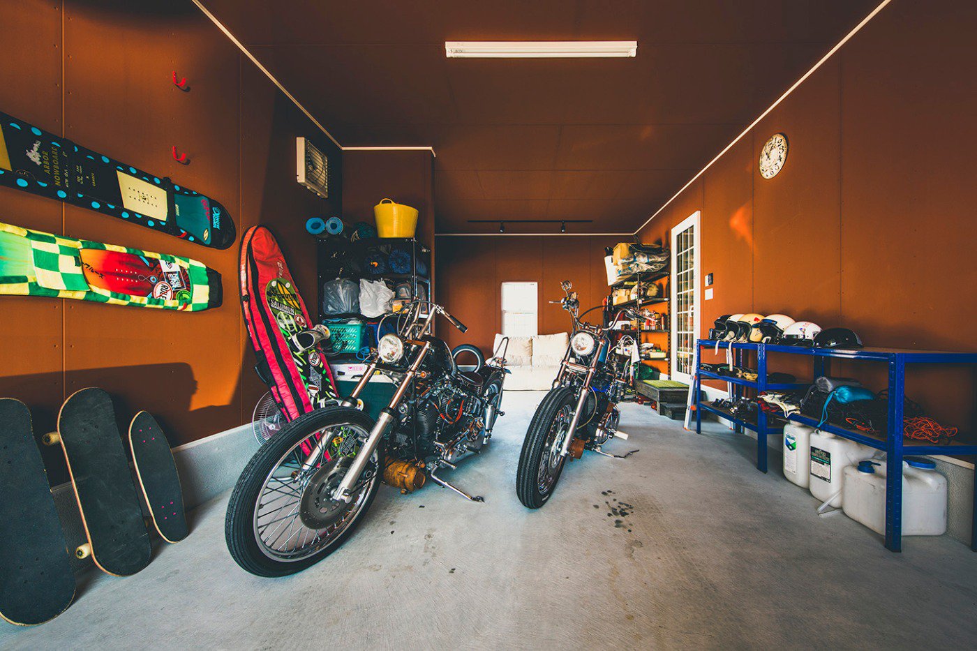 わが家のガレージの良さは、まず「広さ」です。ハイエース1台、バイク3台が並べられて、しかも、十分な整備スペースもあるんです。次に「開口部が2つ」あること。奥にしまったバイクを出すとき、わざわざ車を出すという手間を省けます。重いバイクをバックで出す必要もなく、妻が一人のときでも自由に出し入れができると喜んでいます。冬はスノーボードが好きで夫婦ともに楽しんでいます。壁に専用のフックを取り付け、いつでもボードを眺められるのが嬉しいです。いつか子供と一緒に滑るのを楽しみにしています。以前借りていたガレージの不満点を完璧に解消した、理想の仕上がりに大満足。あまりに居心地がいいので、ソファを置いて自分の部屋のようにしてしまいました。家の中もいいですが、ここでくつろぐ時間もまた格別です。