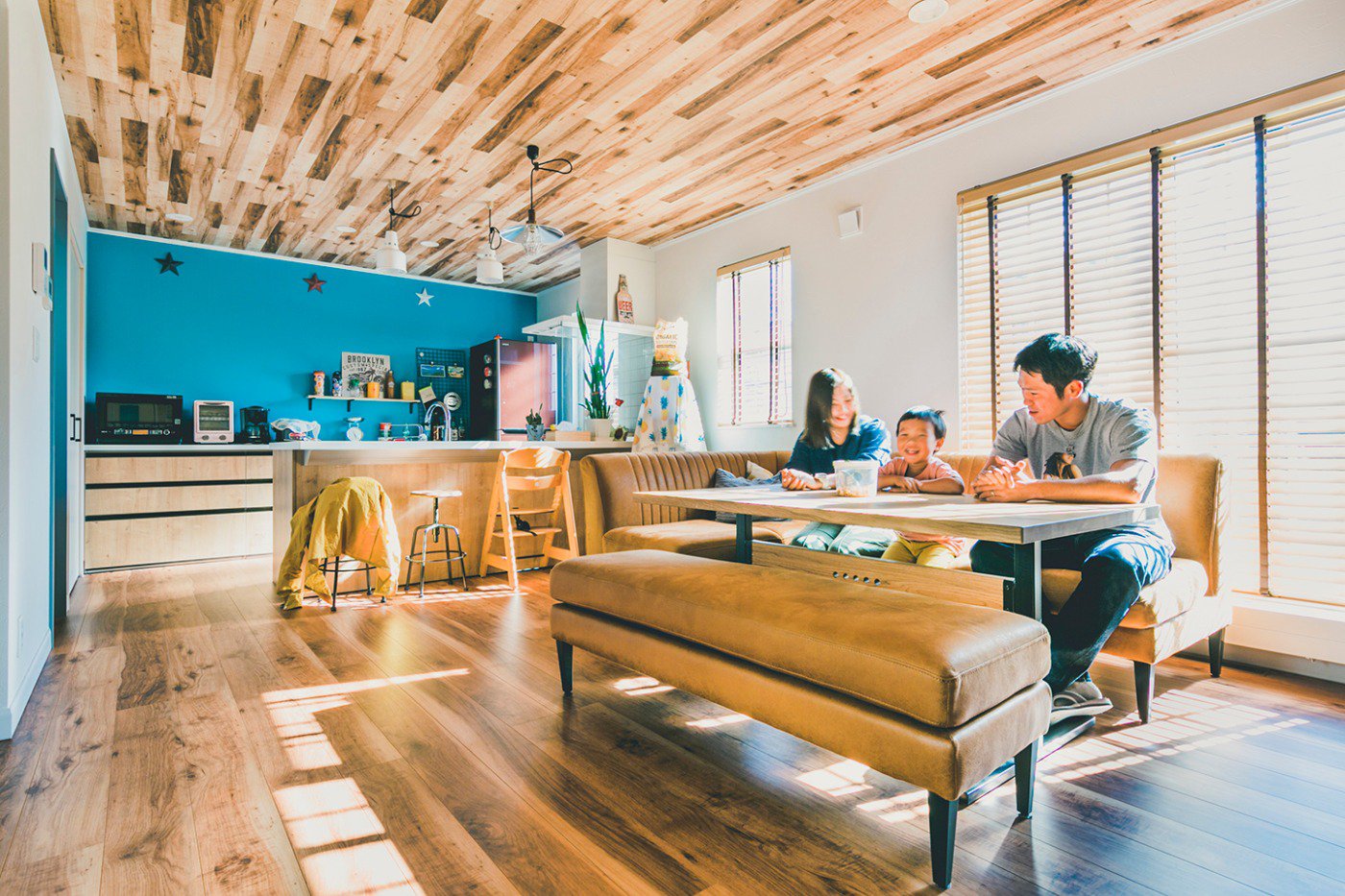 探してくれたここの土地は、ほぼ即決でした。たくさんわがままをいったんですけど、それが叶った感じです。家の中は妻の好みに。ターコイズブルーのクロスは絶対に使いたかったと。やりたいことを全部取り入れられたといっています。ガレージは自分の思うようにつくっています。車庫というより、好きなものを置いて部屋のようにして空間自体を楽しみたくて。建てたあとに買ったバイクも置いています。妻もバイクの免許を取りました。