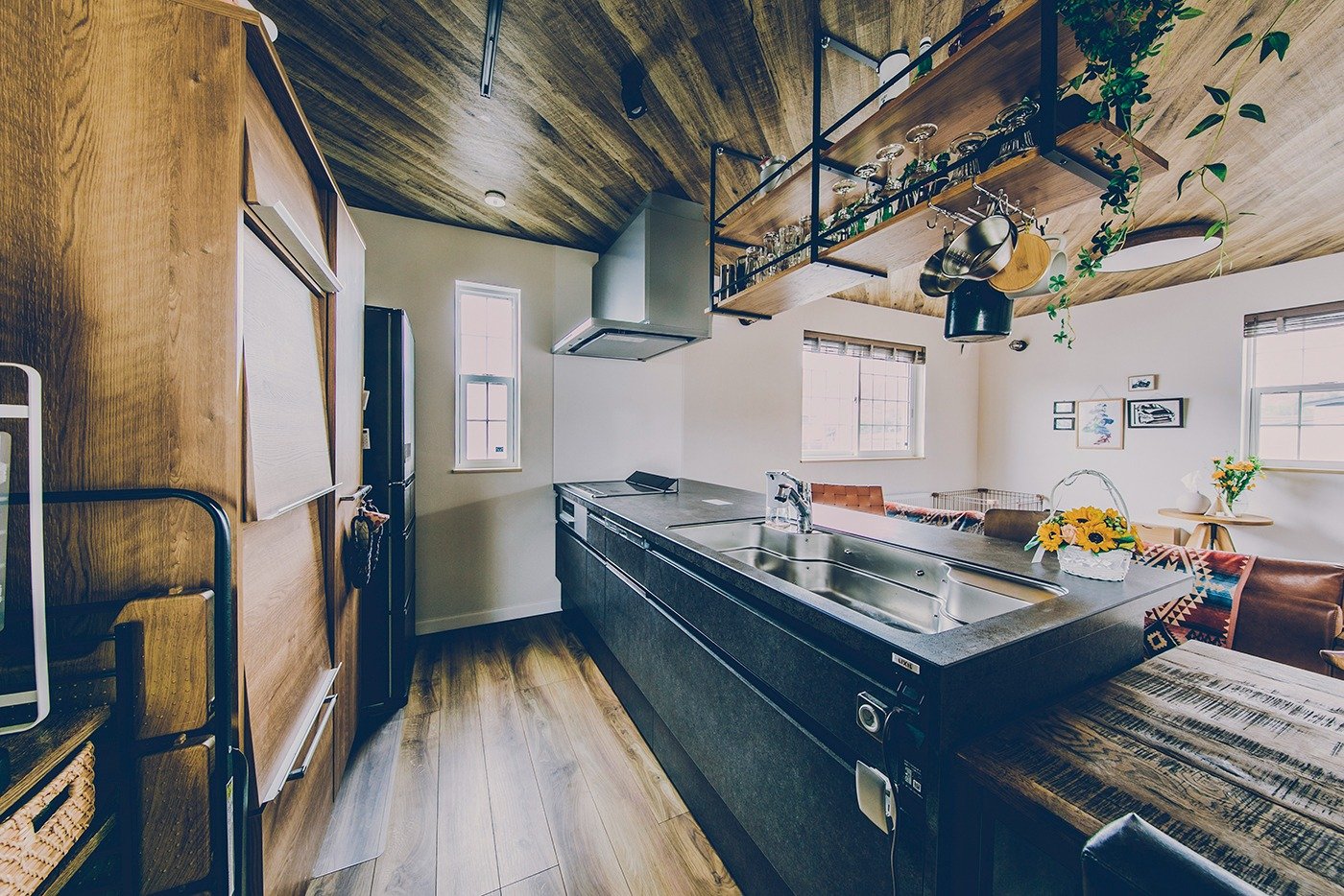 僕はガレージさえあればよくて、ほかのところは妻にお任せでした。妻は料理が好きで、お菓子を作ったりもするので、こだわっていたのがキッチン。トップがセラミックのものを入れたんですが、耐熱性が高いのと、掃除しやすいところもいいと。全体的にはカフェっぽくしたかったようで、オープンな空間にして、吊り棚をつけてっていう感じですね。気に入っているから、キッチンにいるとテンションが上がるって言っています。