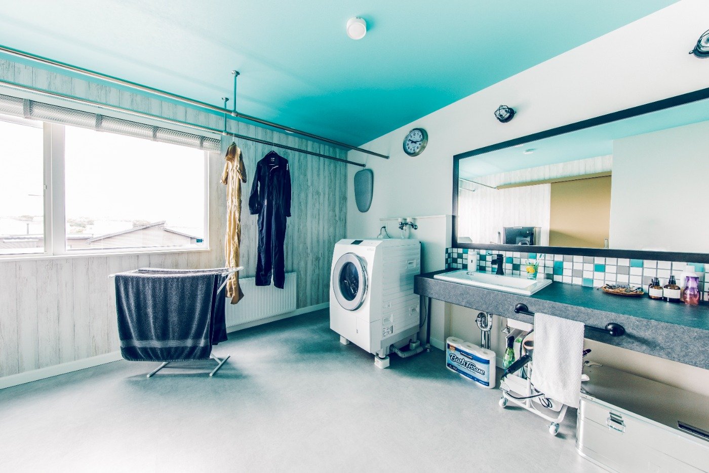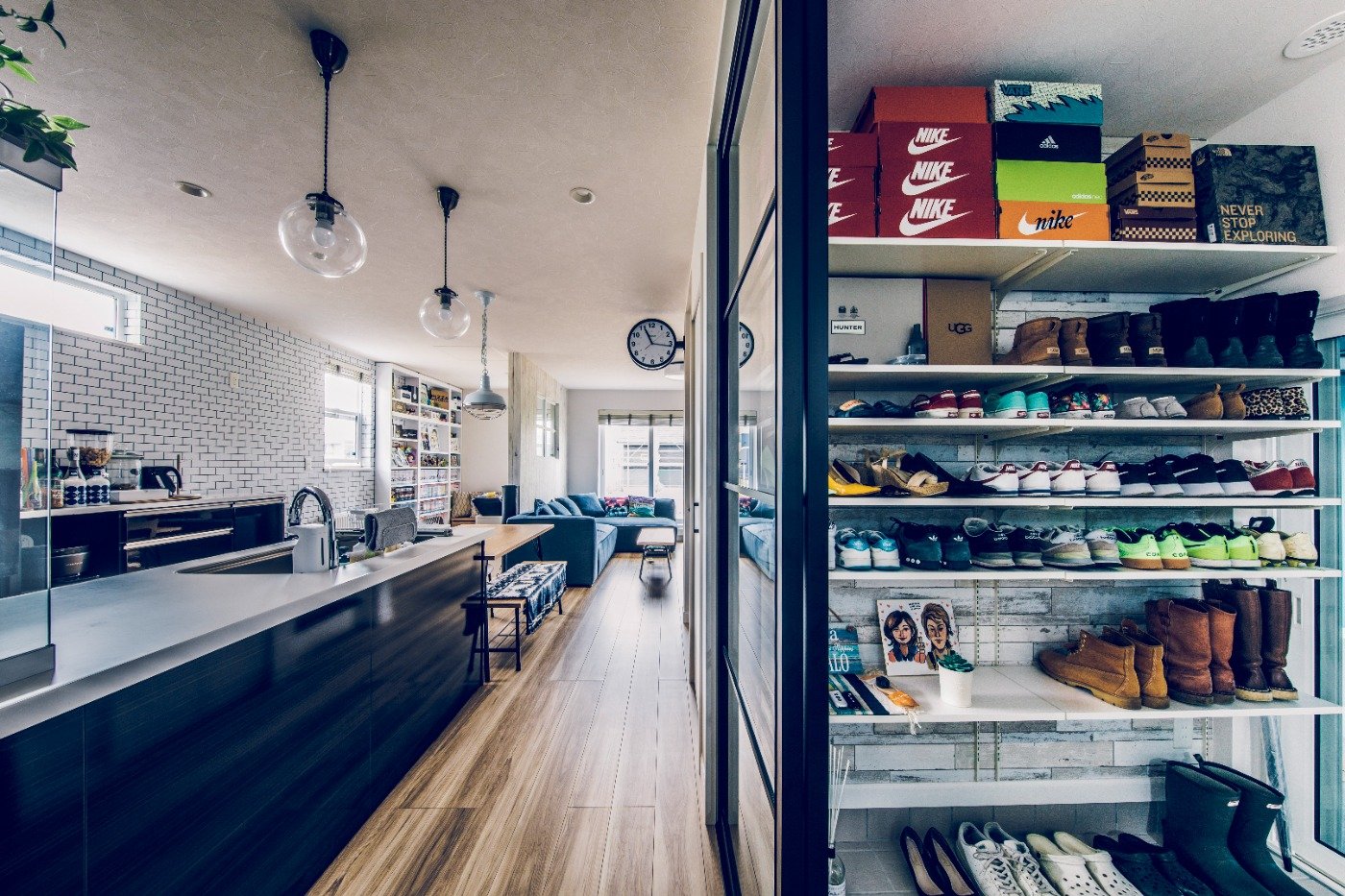 キャンプも好きで、コレクターなところもあるので、とにかく収納をちゃんとしたかったですね。共働きなので、週末に買い溜めもするのでキッチン収納も重要。本やコレクションしたものなどを飾りたかったので、魅せる収納も意識しました。モデルハウスで見た広い洗面所は絶対やりたかったポイント。小さな冷蔵庫を置いて、お風呂上がりにビールを飲むのが格別です!