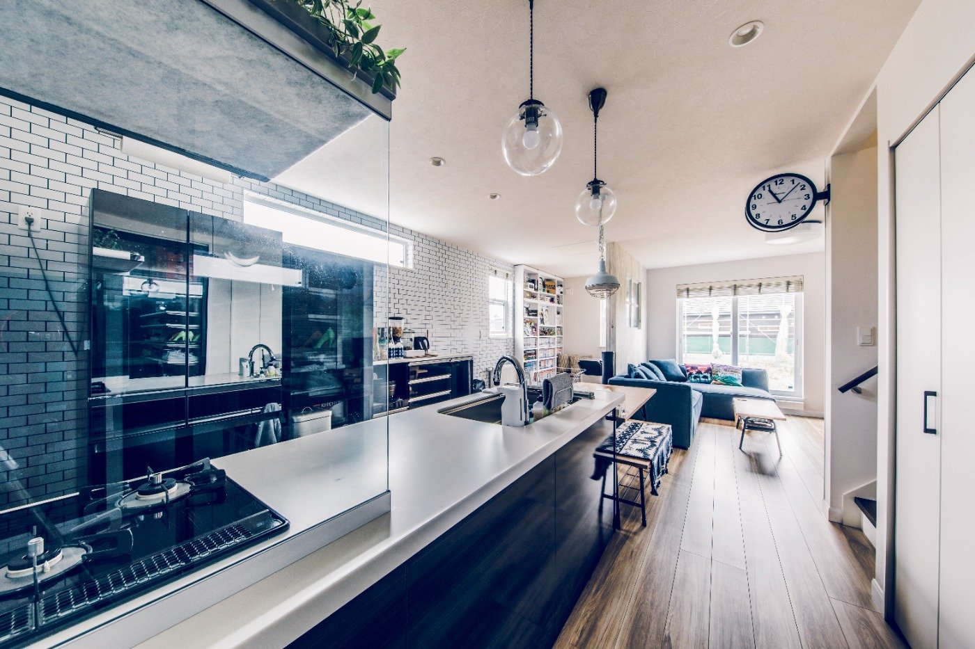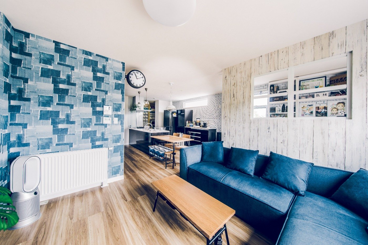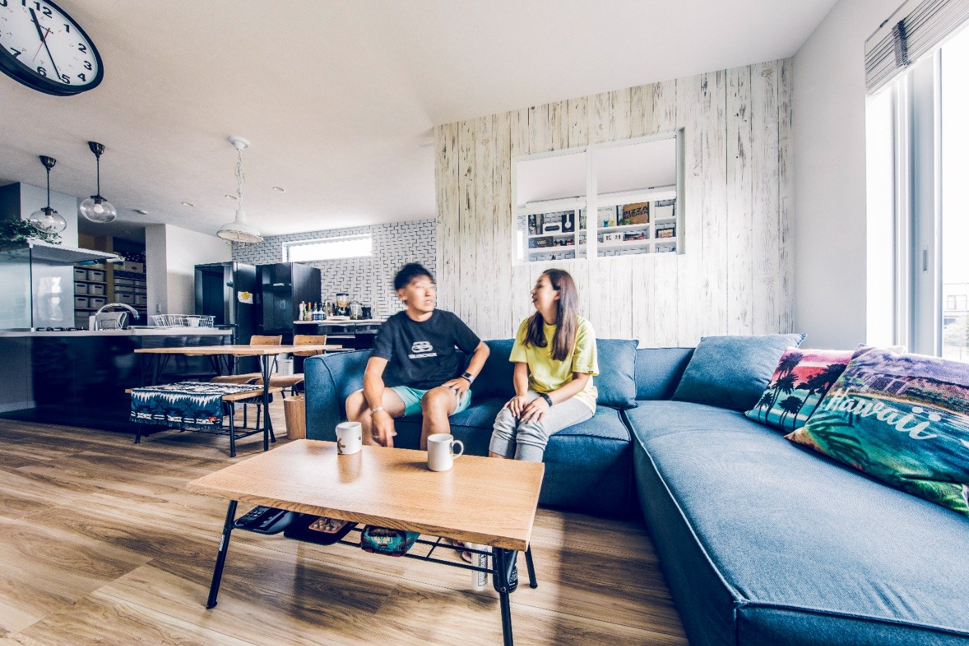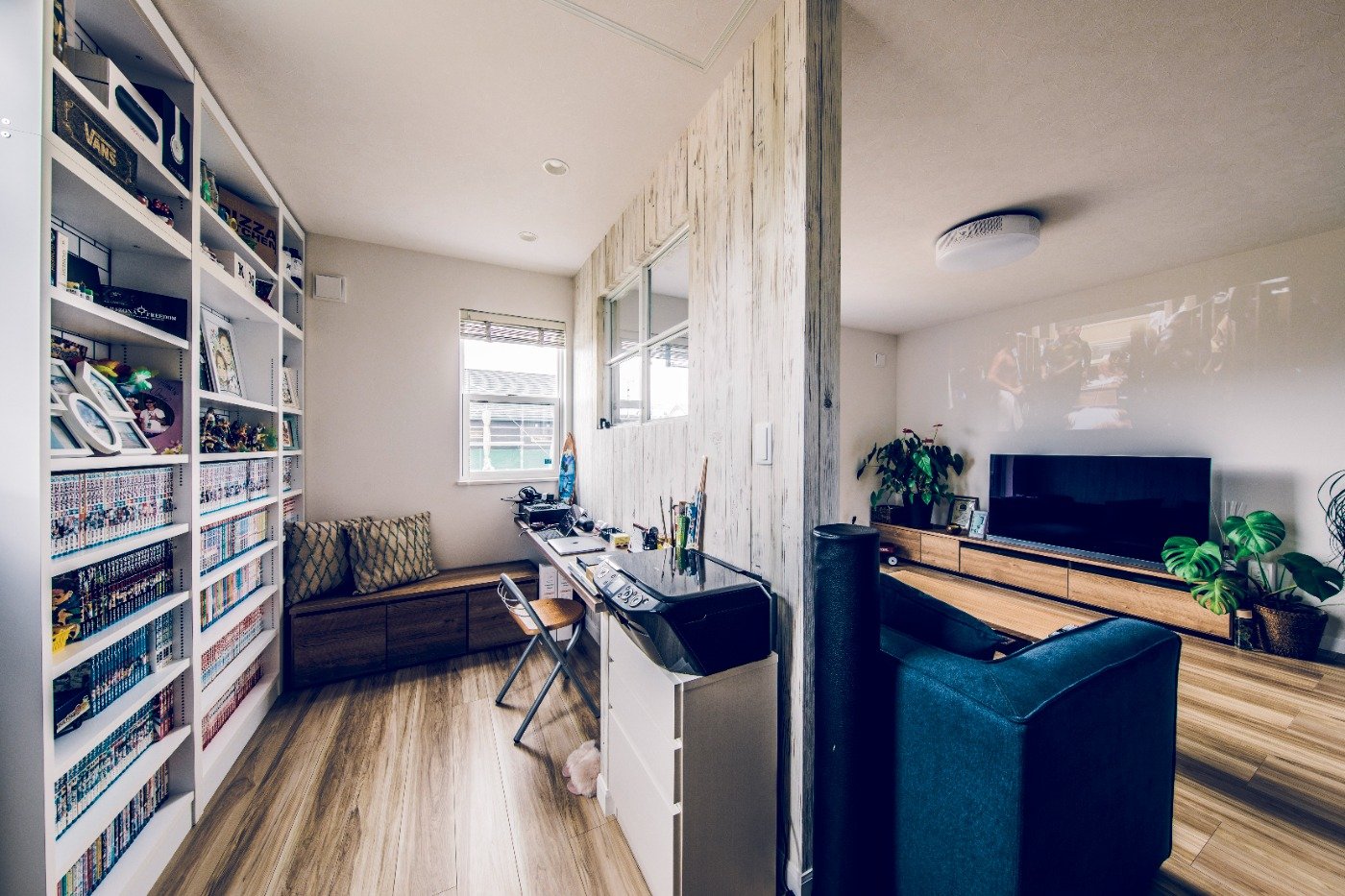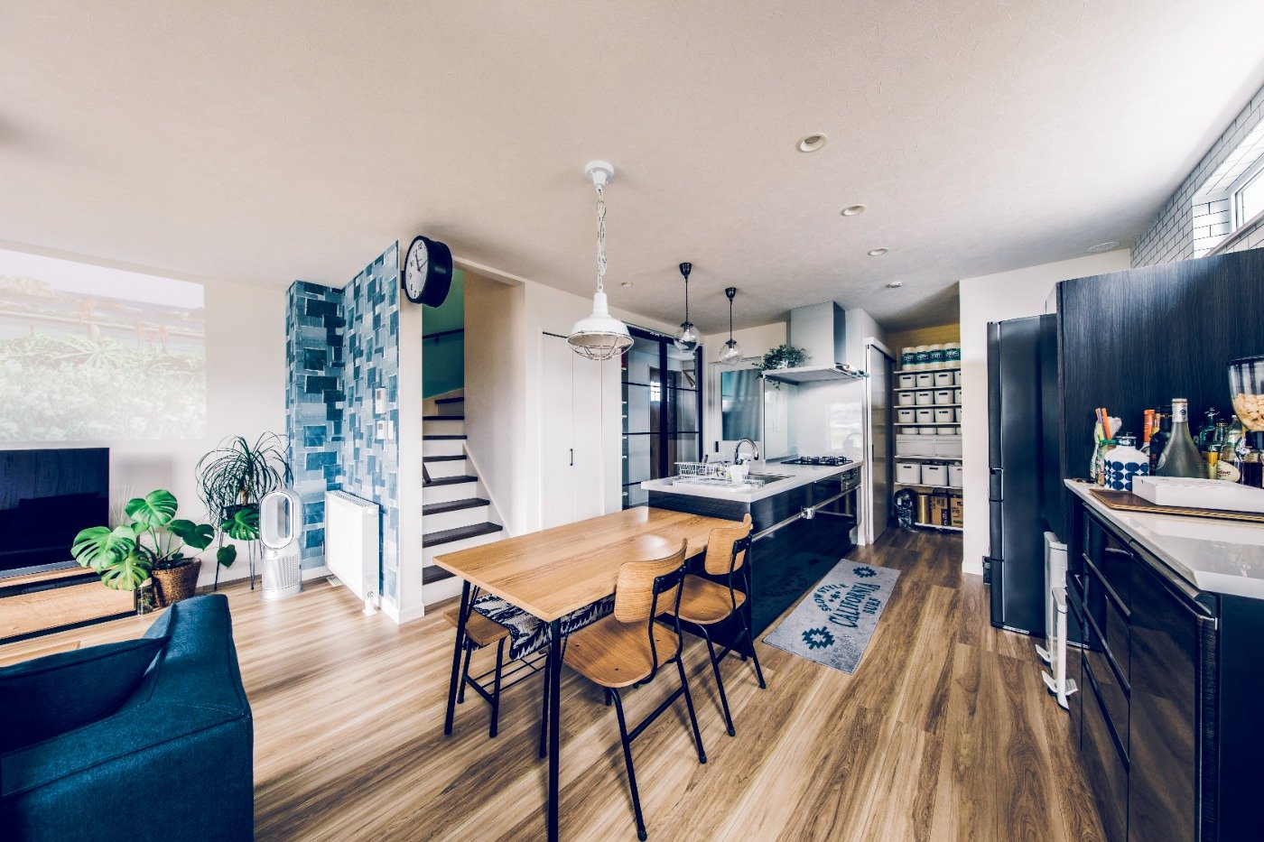 玄関土間のガラス扉もガレージが見えて開放的で気に入っています。インテリアは白を基調にマリンな雰囲気にしました。アクセントで水色を入れて、デニムのクロスもお気に入りです。主人はもっとカラフルにしたかったみたいですが笑。リビングでのんびりと音楽を聞いたり、ゲームをしたり、映画を見たり。明るくて、気持ちいい家になりました。