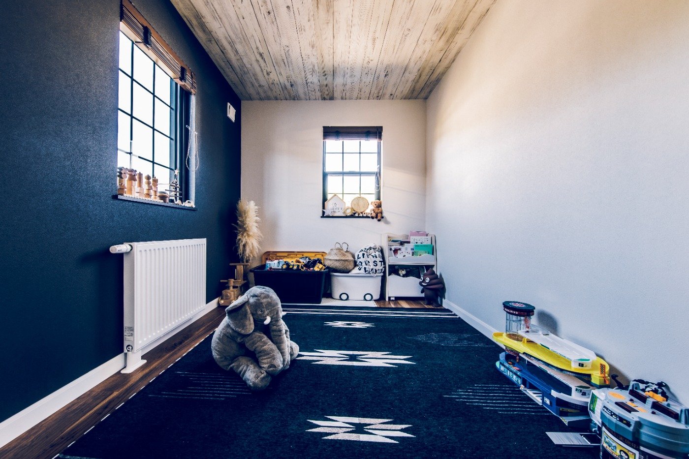 金利や住宅ローン、土地探しなど、家づくりに関することはYouTubeで夜遅くまで勉強しました。毎日寝不足になるくらい、夢中になってましたね。土地は毎日ネットで探して、今の場所を見つけて。担当の方にも見てもらい、サイドガレージが建てられるし、日当たりも良い。70坪の広さがある、この土地に住むことを決心しました。間取りは子ども達がいずれ巣立っても、ふたりで暮らしやすいよう1階を充実。リビングや水回りはすべて1階にして、リビングの他に部屋をひとつ設けました。今は子ども達の遊び場ですが、いずれは自分たちの寝室になる予定。賃貸の時は収納がなくて不便だったから、収納スペースをたくさん確保したかな。基本は極力モノを増やさずスッキリ暮らしたいけど、お互いに服が大好きだから、ウォークインクローゼットやシューズクローゼットは広めに作ってもらいました。家づくりをする前から、外観は絶対黒いガルバに、ガレージの中はオレンジにしようと決めていて。内装は妻の強い意向でマリンテイストに。クロスで空間を遊べるのが楽しかったですね。”唯一無二の家にしたい”って何回も言ってたな笑。自分たちがカッコいいと思うモノがいちばんカッコいいと思ってるから、信念を持って家づくりをしましたね。だからあまり迷うことなく、お互いに好きなモノを選んで今の家が完成しました。