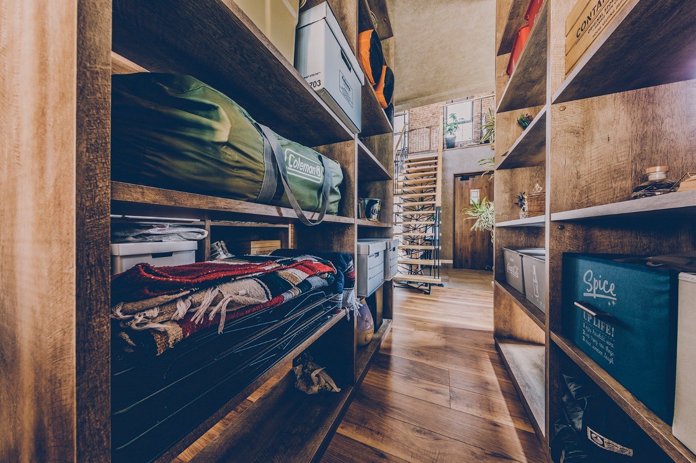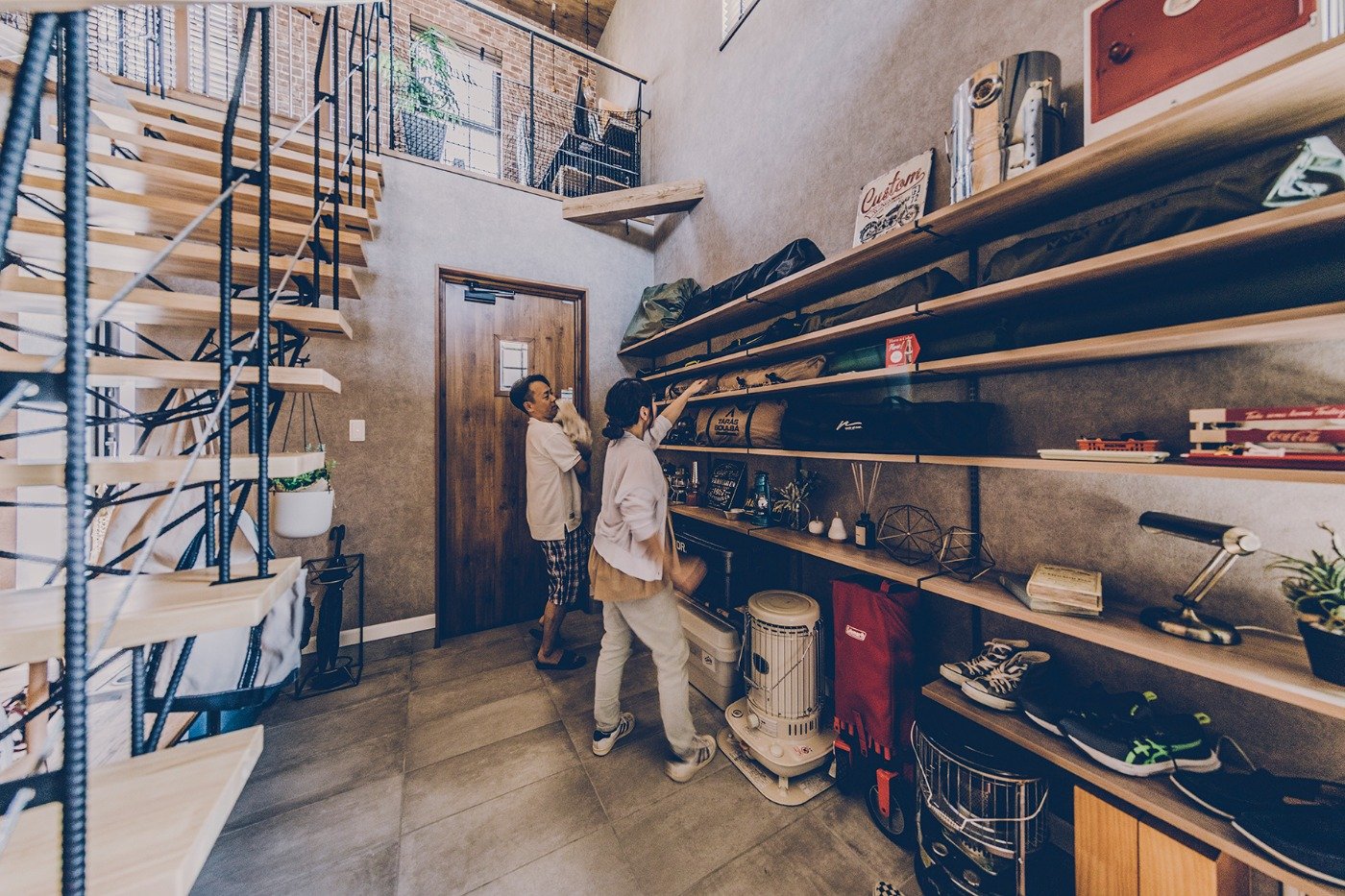 この家の特徴でもある土間とストレージスペースには、趣味のキャンプギアをディスプレイしながら収納しています。賃貸時代はキャンプ道具を仕舞うのにレンタルスペースを借りるほどでしたが、全て収めることができました笑。おかげでキャンプの準備や後片付けも楽になり、快適です。2階のワークスペースの照明や洗面化粧台のタイルなど、間取り以外の細かなところも全部気に入ってます。ここまで突き抜けて、個性的な家は他にはないと思います。デザインだけでなく、暖かさや、オーナーを大事にしている社風にも大満足。オーナーイベントや、インテリアショップで利用できる特典なども嬉しいです。