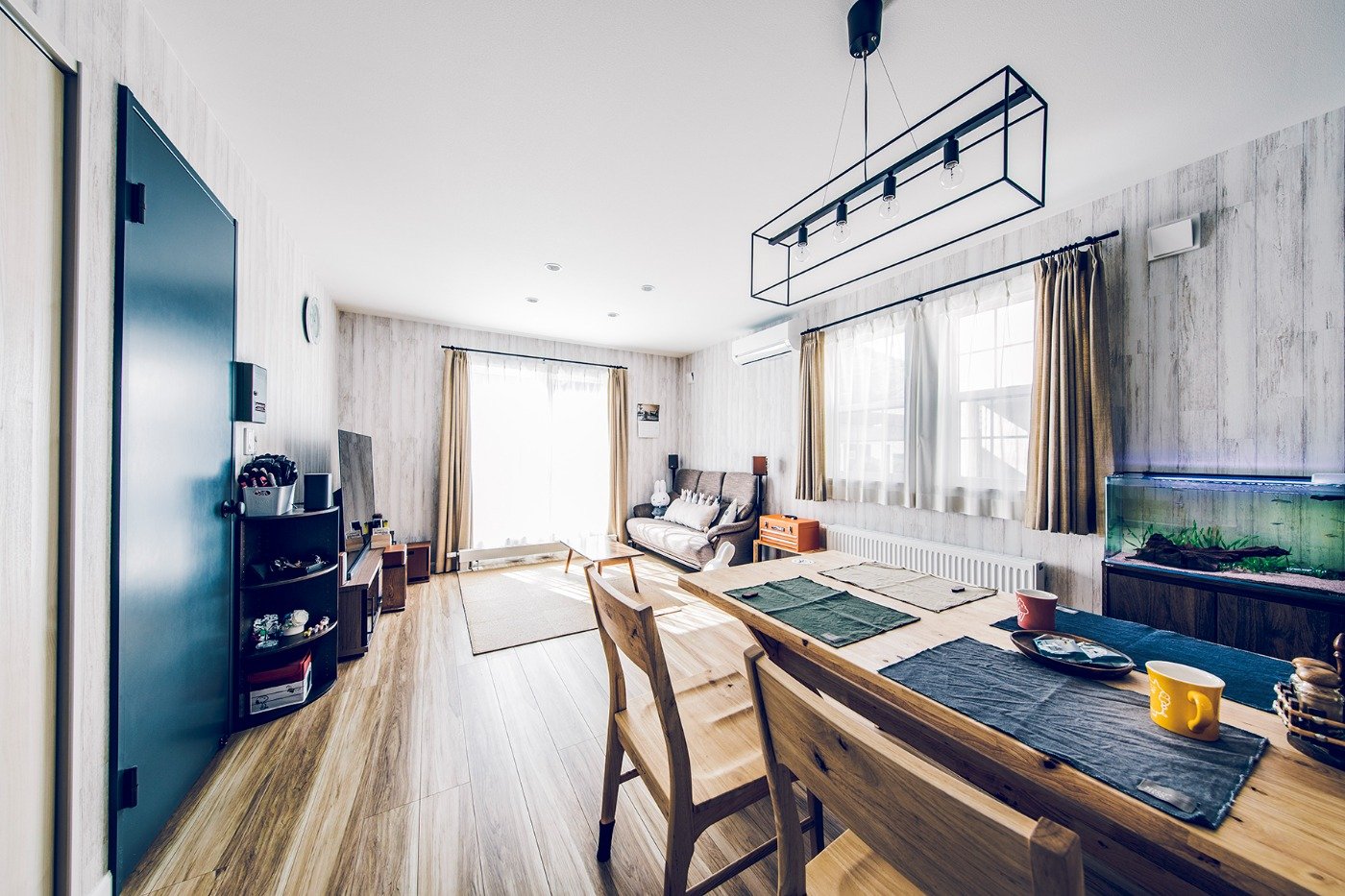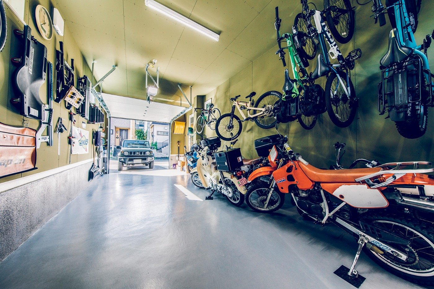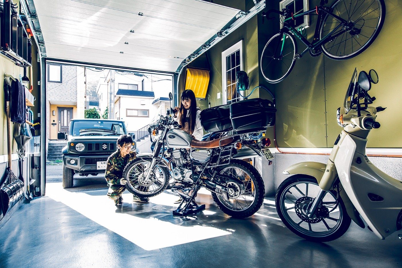 前に住んでいたのは、ガレージ付きの賃貸アパート。車2台・バイク3台・自転車2台を置くには狭いし、何より車の出し入れをするのが大変でした。僕がひとり暮らしをしていたアパートだったから、結婚してふたりで住むには、部屋も水まわりも手狭でしたしね。それに、うさぎの影響も大きいかな。ペット可の物件じゃなかったから、妻が実家で飼っていたうさぎと一緒に暮らせなくて。家づくりを本格的に考え始めたのは、ガレージの中で自転車が倒れて、愛車にキズが付いてしまった時ですね。たまたまアメカジ工務店のチラシが家に入って「こんなガレージハウスに住みたい!」とすぐに有休を取って、ひとりでモデルハウスの見学に行きました。実物のガレージは最高にカッコいいし、カーキの室内ドアやグリーンの外壁など、緑色が好きな僕にハマる家だったんです。後日、妻も連れて、いくつかのオープンハウスを案内してもらったら、広いUTスペースや内装のデザインを気に入ってくれました。他社も比較しようと、総合展示場にも行ったけど、予算もテイストも合わなかったですね。話を聞いた営業マンも、ゴリ押しな感じで、ちょっと違うかなと。僕のアメカジ工務店への決め手は、やっぱりガレージ。車やバイクをただ置くだけじゃない、遊びのある空間に惹かれました。妻は当初、家を建てるのを不安がっていたんです。でも、アメカジのスタッフの皆さんは話しやすく親切で、この会社となら一緒に家づくりがしたいと言うように。おかげで終始、打ち合わせが楽しかったです。住宅ローンや土地探しなど、しっかりサポートしてくれたから、最後まで安心して進めることができました。