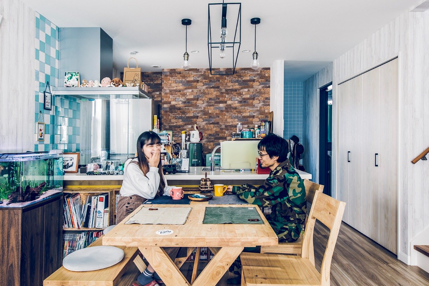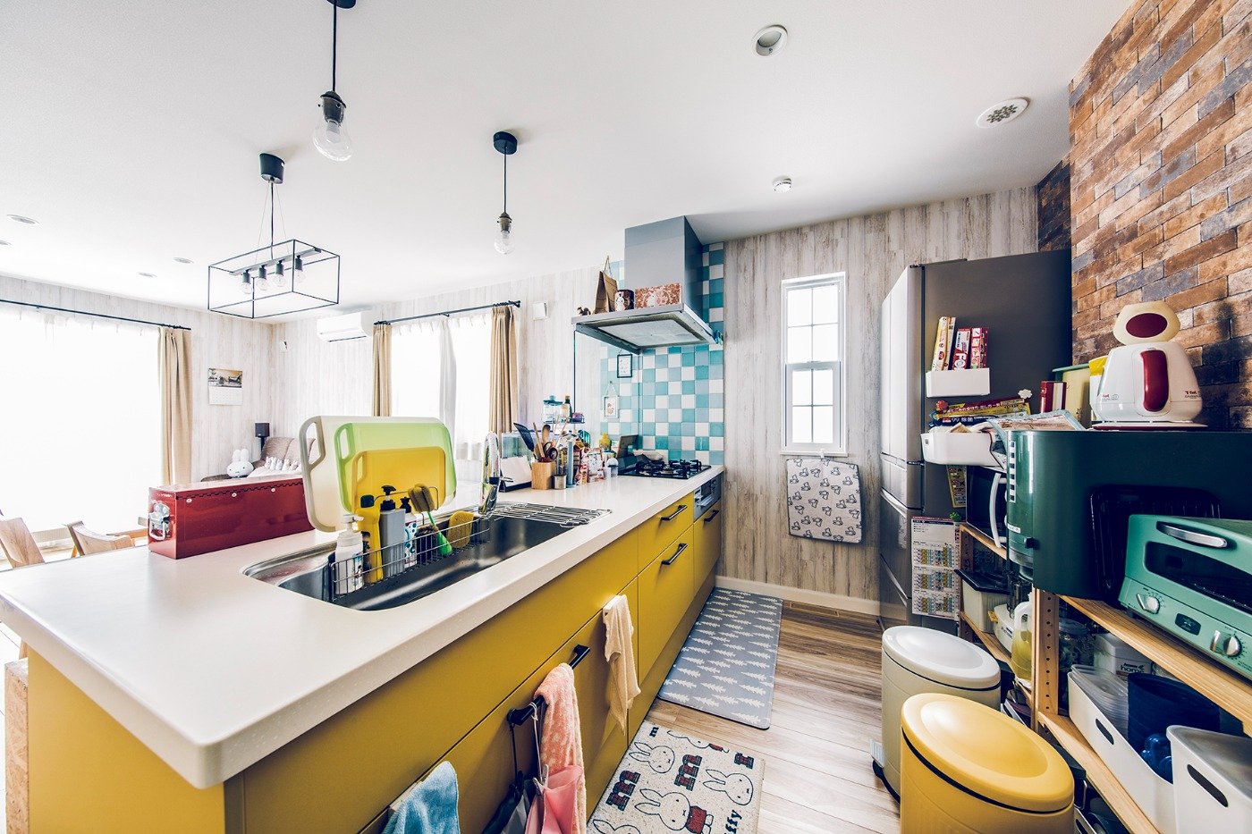 ガレージ以外の内装は、妻の希望で、全体的に明るい雰囲気にしました。コーディネートでいちばん悩んだのは、壁紙選びでしたね。オープンハウスでレンガ調のクロスを使っていて、カッコいいなと印象に残っていたから、キッチンの背面にアクセントで取り入れました。アメカジならではの、塗装したカラフルなドアや、イエローのキッチンも気に入ってます。明るいキッチンで料理をすると、気分が上がると妻も喜んでいます。
