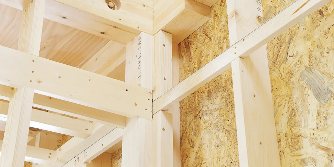 梁と床の根太と呼ばれる床組をなくし、直接合板で貼り固め、床にも剛性を持たせる根太レス工法(剛床工法)を採用しています。